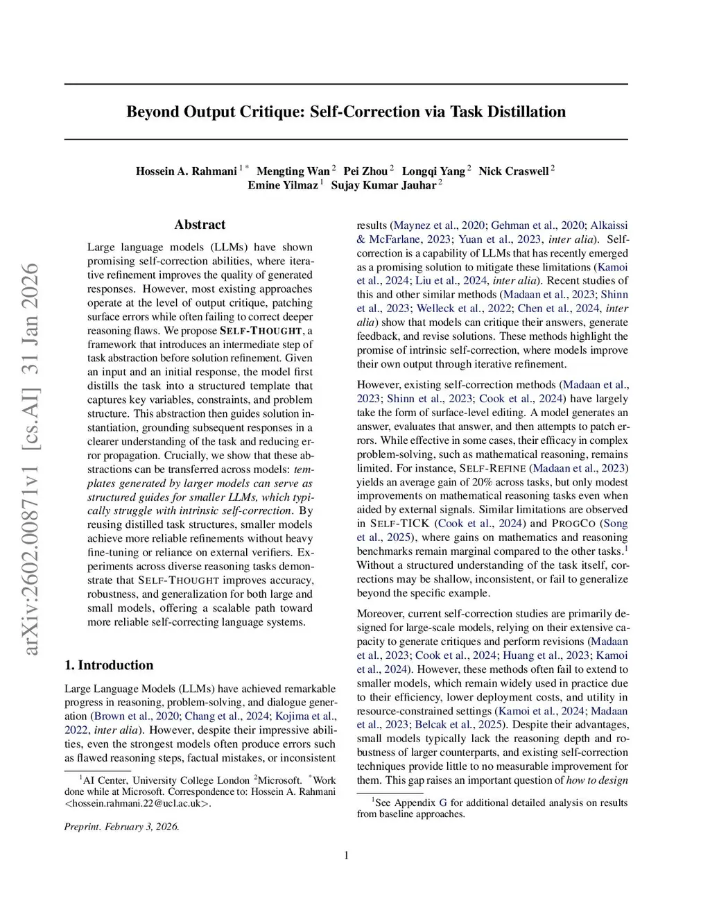 Large language models (LLMs) have shown promising self-correction abilities, where iterative refinement improves the quality of generated responses. However, most existing approaches operate at the level of output critique, patching surface errors while often failing to correct deeper reasoning flaws. We propose SELF-THOUGHT, a framework that introduces an intermediate step of task abstraction before solution refinement. Given an input and an initial response, the model first distills the task into a structured template that captures key variables, constraints, and problem structure. This abstraction then guides solution instantiation, grounding subsequent responses in a clearer understanding of the task and reducing error propagation. Crucially, we show that these abstractions can be transferred across models: templates generated by larger models can serve as structured guides for smaller LLMs, which typically struggle with intrinsic self-correction. By reusing distilled task structures, smaller models achieve more reliable refinements without heavy fine-tuning or reliance on external verifiers. Experiments across diverse reasoning tasks demonstrate that SELF-THOUGHT improves accuracy, robustness, and generalization for both large and small models, offering a scalable path toward more reliable self-correcting language systems.