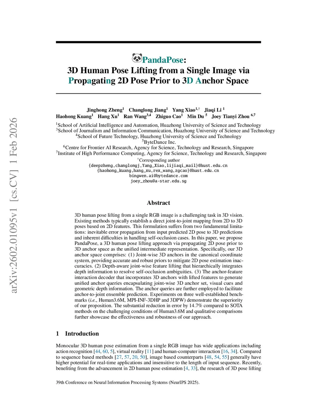 PandaPose: 3D Human Pose Lifting from a Single Image via Propagating 2D Pose Prior to 3D Anchor Space