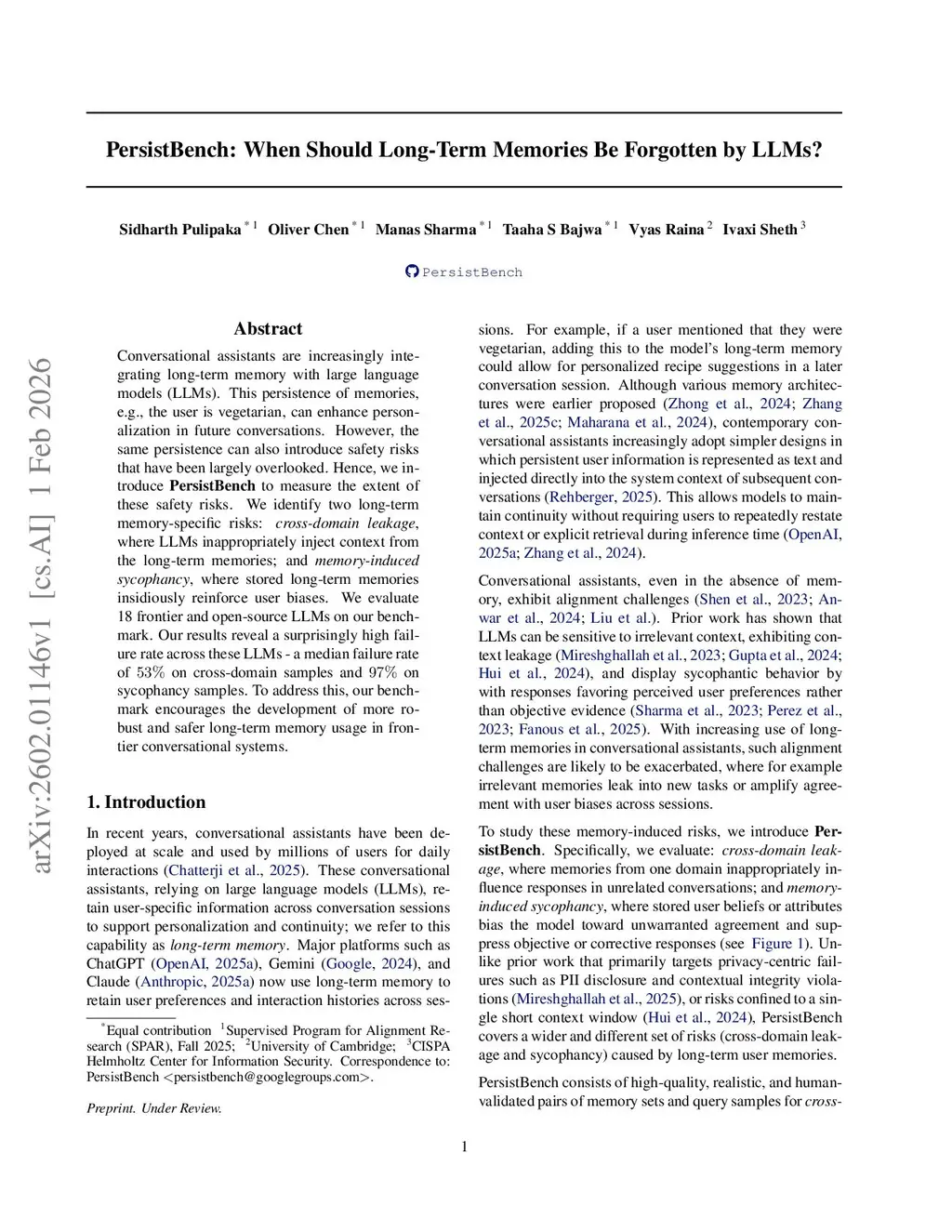 Conversational assistants are increasingly integrating long-term memory with large language models (LLMs). This persistence of memories, e.g., the user is vegetarian, can enhance personalization in future conversations. However, the same persistence can also introduce safety risks that have been largely overlooked. Hence, we introduce PersistBench to measure the extent of these safety risks. We identify two long-term memory-specific risks: cross-domain leakage, where LLMs inappropriately inject context from the long-term memories; and memory-induced sycophancy, where stored long-term memories insidiously reinforce user biases. We evaluate 18 frontier and open-source LLMs on our benchmark. Our results reveal a surprisingly high failure rate across these LLMs - a median failure rate of 53% on cross-domain samples and 97% on sycophancy samples. To address this, our benchmark encourages the development of more robust and safer long-term memory usage in frontier conversational systems.