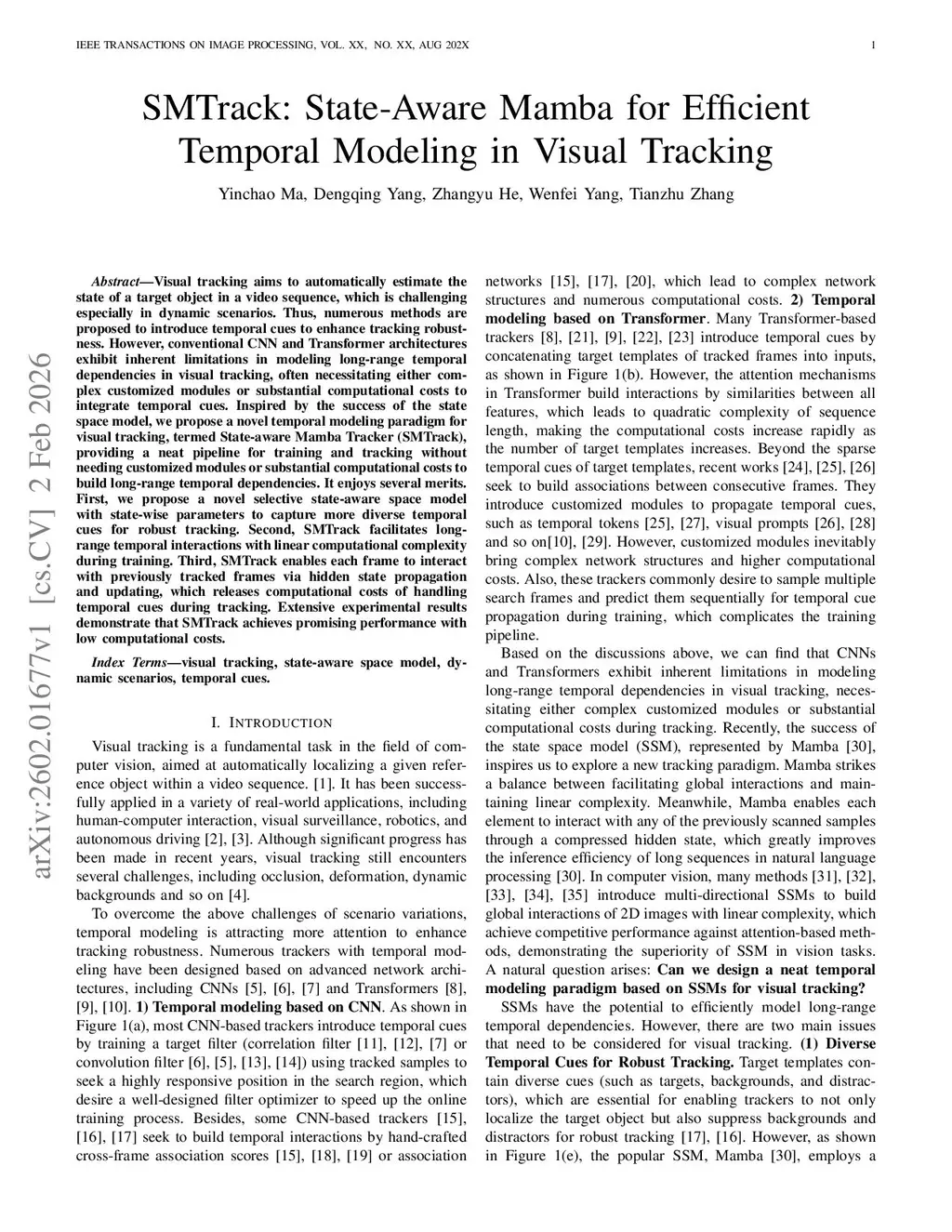 Visual tracking aims to automatically estimate the state of a target object in a video sequence, which is challenging especially in dynamic scenarios. Thus, numerous methods are proposed to introduce temporal cues to enhance tracking robustness. However, conventional CNN and Transformer architectures exhibit inherent limitations in modeling long-range temporal dependencies in visual tracking, often necessitating either complex customized modules or substantial computational costs to integrate temporal cues. Inspired by the success of the state space model, we propose a novel temporal modeling paradigm for visual tracking, termed State-aware Mamba Tracker (SMTrack), providing a neat pipeline for training and tracking without needing customized modules or substantial computational costs to build long-range temporal dependencies. It enjoys several merits. First, we propose a novel selective state-aware space model with state-wise parameters to capture more diverse temporal cues for robust tracking. Second, SMTrack facilitates long-range temporal interactions with linear computational complexity during training. Third, SMTrack enables each frame to interact with previously tracked frames via hidden state propagation and updating, which releases computational costs of handling temporal cues during tracking. Extensive experimental results demonstrate that SMTrack achieves promising performance with low computational costs.