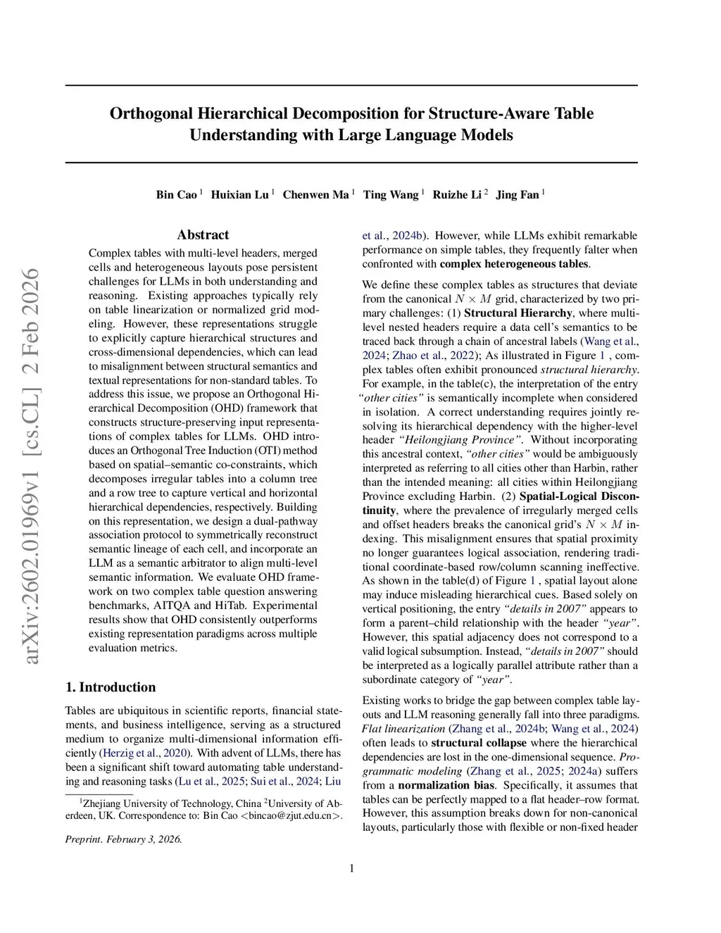 Complex tables with multi-level headers, merged cells and heterogeneous layouts pose persistent challenges for LLMs in both understanding and reasoning. Existing approaches typically rely on table linearization or normalized grid modeling. However, these representations struggle to explicitly capture hierarchical structures and cross-dimensional dependencies, which can lead to misalignment between structural semantics and textual representations for non-standard tables. To address this issue, we propose an Orthogonal Hierarchical Decomposition (OHD) framework that constructs structure-preserving input representations of complex tables for LLMs. OHD introduces an Orthogonal Tree Induction (OTI) method based on spatial--semantic co-constraints, which decomposes irregular tables into a column tree and a row tree to capture vertical and horizontal hierarchical dependencies, respectively. Building on this representation, we design a dual-pathway association protocol to symmetrically reconstruct semantic lineage of each cell, and incorporate an LLM as a semantic arbitrator to align multi-level semantic information. We evaluate OHD framework on two complex table question answering benchmarks, AITQA and HiTab. Experimental results show that OHD consistently outperforms existing representation paradigms across multiple evaluation metrics.