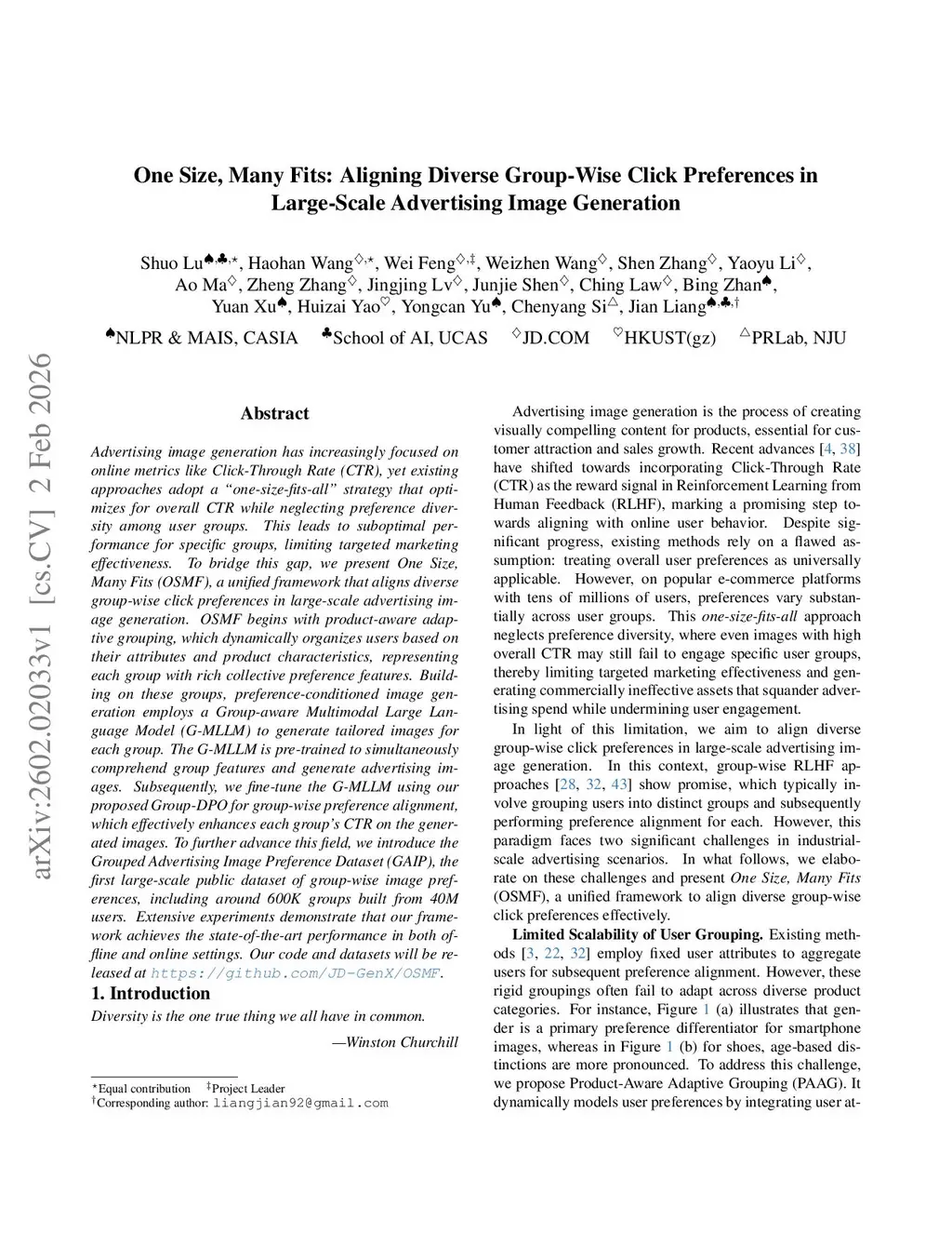 Advertising image generation has increasingly focused on online metrics like Click-Through Rate (CTR), yet existing approaches adopt a ``one-size-fits-all" strategy that optimizes for overall CTR while neglecting preference diversity among user groups. This leads to suboptimal performance for specific groups, limiting targeted marketing effectiveness. To bridge this gap, we present \textit{One Size, Many Fits} (OSMF), a unified framework that aligns diverse group-wise click preferences in large-scale advertising image generation. OSMF begins with product-aware adaptive grouping, which dynamically organizes users based on their attributes and product characteristics, representing each group with rich collective preference features. Building on these groups, preference-conditioned image generation employs a Group-aware Multimodal Large Language Model (G-MLLM) to generate tailored images for each group. The G-MLLM is pre-trained to simultaneously comprehend group features and generate advertising images. Subsequently, we fine-tune the G-MLLM using our proposed Group-DPO for group-wise preference alignment, which effectively enhances each group's CTR on the generated images. To further advance this field, we introduce the Grouped Advertising Image Preference Dataset (GAIP), the first large-scale public dataset of group-wise image preferences, including around 600K groups built from 40M users. Extensive experiments demonstrate that our framework achieves the state-of-the-art performance in both offline and online settings. Our code and datasets will be released atthis https URL.