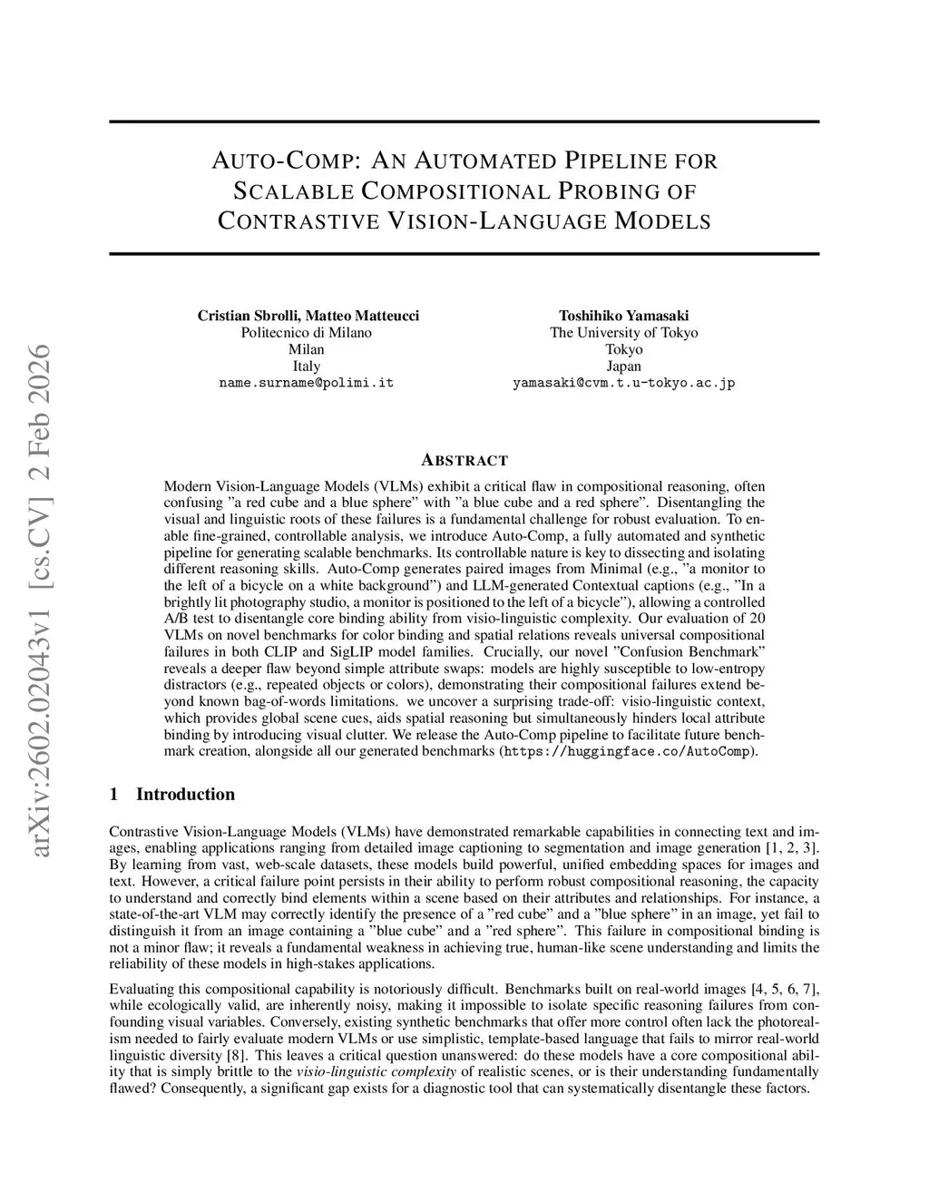 Modern Vision-Language Models (VLMs) exhibit a critical flaw in compositional reasoning, often confusing "a red cube and a blue sphere" with "a blue cube and a red sphere". Disentangling the visual and linguistic roots of these failures is a fundamental challenge for robust evaluation. To enable fine-grained, controllable analysis, we introduce Auto-Comp, a fully automated and synthetic pipeline for generating scalable benchmarks. Its controllable nature is key to dissecting and isolating different reasoning skills. Auto-Comp generates paired images from Minimal (e.g., "a monitor to the left of a bicycle on a white background") and LLM-generated Contextual captions (e.g., "In a brightly lit photography studio, a monitor is positioned to the left of a bicycle"), allowing a controlled A/B test to disentangle core binding ability from visio-linguistic complexity. Our evaluation of 20 VLMs on novel benchmarks for color binding and spatial relations reveals universal compositional failures in both CLIP and SigLIP model families. Crucially, our novel "Confusion Benchmark" reveals a deeper flaw beyond simple attribute swaps: models are highly susceptible to low-entropy distractors (e.g., repeated objects or colors), demonstrating their compositional failures extend beyond known bag-of-words limitations. we uncover a surprising trade-off: visio-linguistic context, which provides global scene cues, aids spatial reasoning but simultaneously hinders local attribute binding by introducing visual clutter. We release the Auto-Comp pipeline to facilitate future benchmark creation, alongside all our generated benchmarks (this https URL).