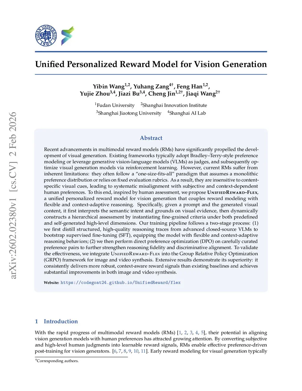 Recent advancements in multimodal reward models (RMs) have significantly propelled the development of visual generation. Existing frameworks typically adopt Bradley-Terry-style preference modeling or leverage generative VLMs as judges, and subsequently optimize visual generation models via reinforcement learning. However, current RMs suffer from inherent limitations: they often follow a one-size-fits-all paradigm that assumes a monolithic preference distribution or relies on fixed evaluation rubrics. As a result, they are insensitive to content-specific visual cues, leading to systematic misalignment with subjective and context-dependent human preferences. To this end, inspired by human assessment, we propose UnifiedReward-Flex, a unified personalized reward model for vision generation that couples reward modeling with flexible and context-adaptive reasoning. Specifically, given a prompt and the generated visual content, it first interprets the semantic intent and grounds on visual evidence, then dynamically constructs a hierarchical assessment by instantiating fine-grained criteria under both predefined and self-generated high-level dimensions. Our training pipeline follows a two-stage process: (1) we first distill structured, high-quality reasoning traces from advanced closed-source VLMs to bootstrap SFT, equipping the model with flexible and context-adaptive reasoning behaviors; (2) we then perform direct preference optimization (DPO) on carefully curated preference pairs to further strengthen reasoning fidelity and discriminative alignment. To validate the effectiveness, we integrate UnifiedReward-Flex into the GRPO framework for image and video synthesis, and extensive results demonstrate its superiority.