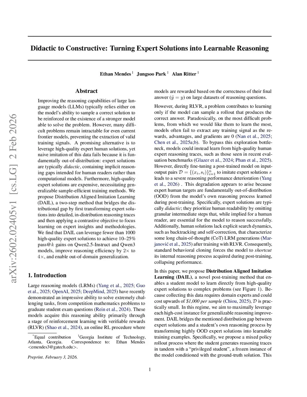 Improving the reasoning capabilities of large language models (LLMs) typically relies either on the model's ability to sample a correct solution to be reinforced or on the existence of a stronger model able to solve the problem. However, many difficult problems remain intractable for even current frontier models, preventing the extraction of valid training signals. A promising alternative is to leverage high-quality expert human solutions, yet naive imitation of this data fails because it is fundamentally out of distribution: expert solutions are typically didactic, containing implicit reasoning gaps intended for human readers rather than computational models. Furthermore, high-quality expert solutions are expensive, necessitating generalizable sample-efficient training methods. We propose Distribution Aligned Imitation Learning (DAIL), a two-step method that bridges the distributional gap by first transforming expert solutions into detailed, in-distribution reasoning traces and then applying a contrastive objective to focus learning on expert insights and methodologies. We find that DAIL can leverage fewer than 1000 high-quality expert solutions to achieve 10-25% pass@k gains on Qwen2.5-Instruct and Qwen3 models, improve reasoning efficiency by 2x to 4x, and enable out-of-domain generalization.