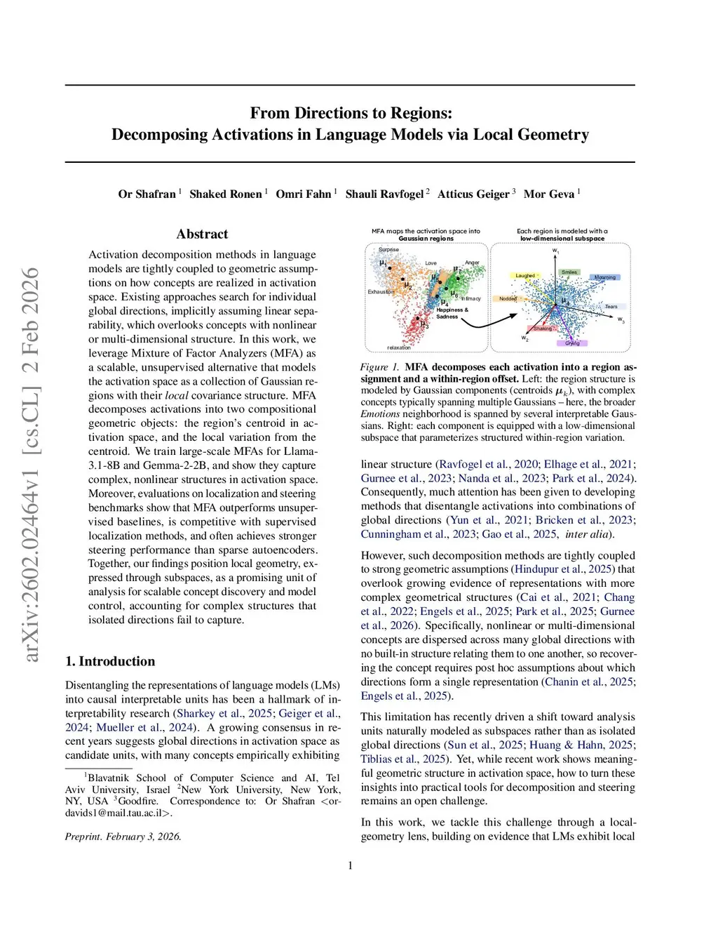 Activation decomposition methods in language models are tightly coupled to geometric assumptions on how concepts are realized in activation space. Existing approaches search for individual global directions, implicitly assuming linear separability, which overlooks concepts with nonlinear or multi-dimensional structure. In this work, we leverage Mixture of Factor Analyzers (MFA) as a scalable, unsupervised alternative that models the activation space as a collection of Gaussian regions with their local covariance structure. MFA decomposes activations into two compositional geometric objects: the region's centroid in activation space, and the local variation from the centroid. We train large-scale MFAs for Llama-3.1-8B and Gemma-2-2B, and show they capture complex, nonlinear structures in activation space. Moreover, evaluations on localization and steering benchmarks show that MFA outperforms unsupervised baselines, is competitive with supervised localization methods, and often achieves stronger steering performance than sparse autoencoders. Together, our findings position local geometry, expressed through subspaces, as a promising unit of analysis for scalable concept discovery and model control, accounting for complex structures that isolated directions fail to capture.