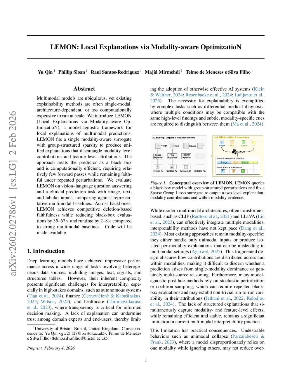 Multimodal models are ubiquitous, yet existing explainability methods are often single-modal, architecture-dependent, or too computationally expensive to run at scale. We introduce LEMON (Local Explanations via Modality-aware OptimizatioN), a model-agnostic framework for local explanations of multimodal predictions. LEMON fits a single modality-aware surrogate with group-structured sparsity to produce unified explanations that disentangle modality-level contributions and feature-level attributions. The approach treats the predictor as a black box and is computationally efficient, requiring relatively few forward passes while remaining faithful under repeated perturbations. We evaluate LEMON on vision-language question answering and a clinical prediction task with image, text, and tabular inputs, comparing against representative multimodal baselines. Across backbones, LEMON achieves competitive deletion-based faithfulness while reducing black-box evaluations by 35-67 times and runtime by 2-8 times compared to strong multimodal baselines.