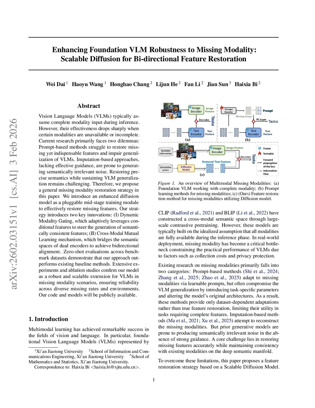 Enhancing Foundation VLM Robustness to Missing Modality: Scalable Diffusion for Bi-directional Feature Restoration