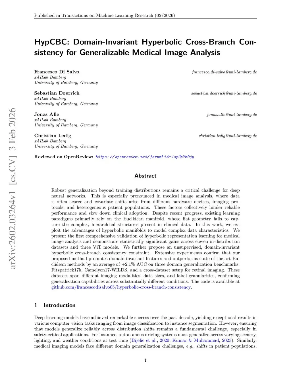 Robust generalization beyond training distributions remains a critical challenge for deep neural networks. This is especially pronounced in medical image analysis, where data is often scarce and covariate shifts arise from different hardware devices, imaging protocols, and heterogeneous patient populations. These factors collectively hinder reliable performance and slow down clinical adoption. Despite recent progress, existing learning paradigms primarily rely on the Euclidean manifold, whose flat geometry fails to capture the complex, hierarchical structures present in clinical data. In this work, we exploit the advantages of hyperbolic manifolds to model complex data characteristics. We present the first comprehensive validation of hyperbolic representation learning for medical image analysis and demonstrate statistically significant gains across eleven in-distribution datasets and three ViT models. We further propose an unsupervised, domain-invariant hyperbolic cross-branch consistency constraint. Extensive experiments confirm that our proposed method promotes domain-invariant features and outperforms state-of-the-art Euclidean methods by an average of AUC on three domain generalization benchmarks: Fitzpatrick17k, Camelyon17-WILDS, and a cross-dataset setup for retinal imaging. These datasets span different imaging modalities, data sizes, and label granularities, confirming generalization capabilities across substantially different conditions. The code is available atthis https URL.