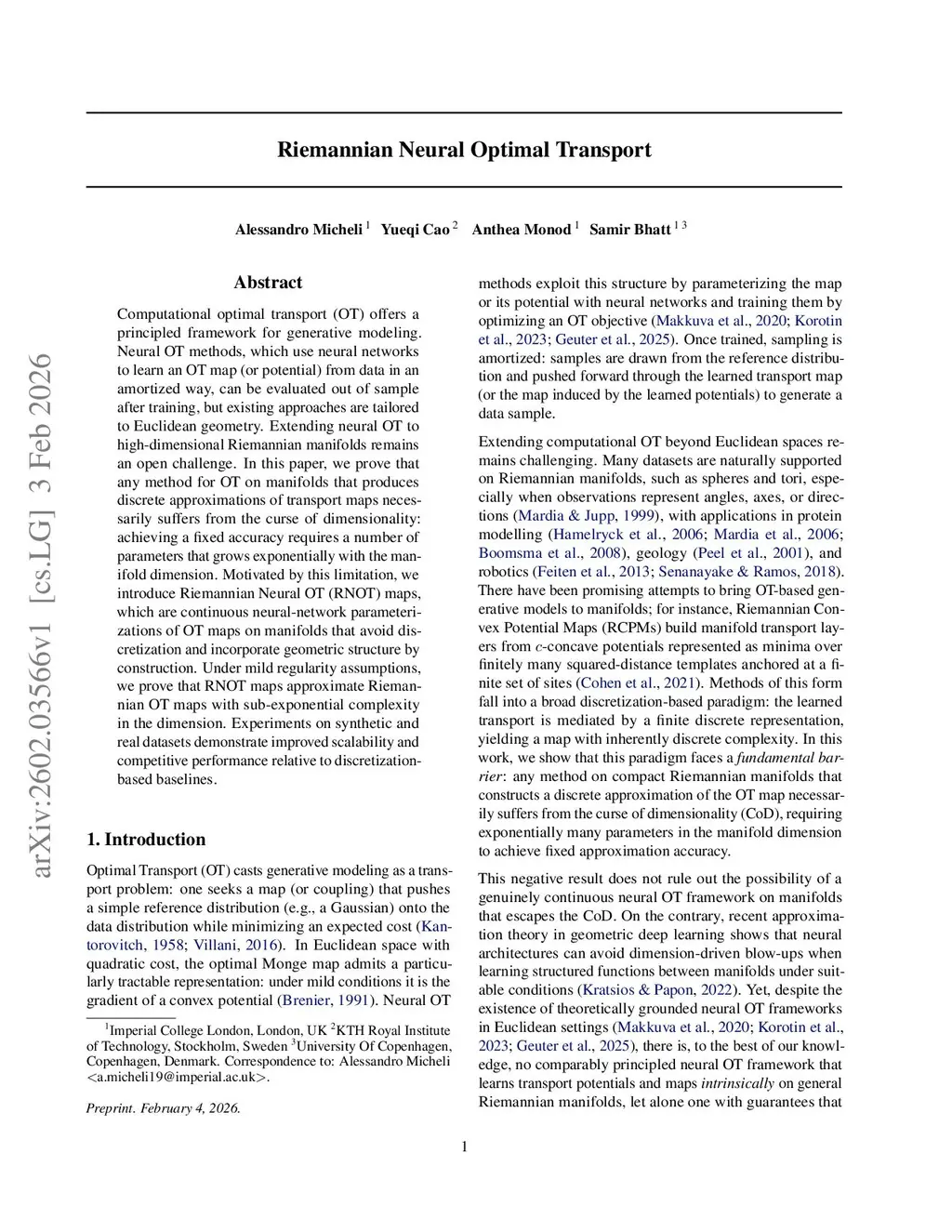 Computational optimal transport (OT) offers a principled framework for generative modeling. Neural OT methods, which use neural networks to learn an OT map (or potential) from data in an amortized way, can be evaluated out of sample after training, but existing approaches are tailored to Euclidean geometry. Extending neural OT to high-dimensional Riemannian manifolds remains an open challenge. In this paper, we prove that any method for OT on manifolds that produces discrete approximations of transport maps necessarily suffers from the curse of dimensionality: achieving a fixed accuracy requires a number of parameters that grows exponentially with the manifold dimension. Motivated by this limitation, we introduce Riemannian Neural OT (RNOT) maps, which are continuous neural-network parameterizations of OT maps on manifolds that avoid discretization and incorporate geometric structure by construction. Under mild regularity assumptions, we prove that RNOT maps approximate Riemannian OT maps with sub-exponential complexity in the dimension. Experiments on synthetic and real datasets demonstrate improved scalability and competitive performance relative to discretization-based baselines.