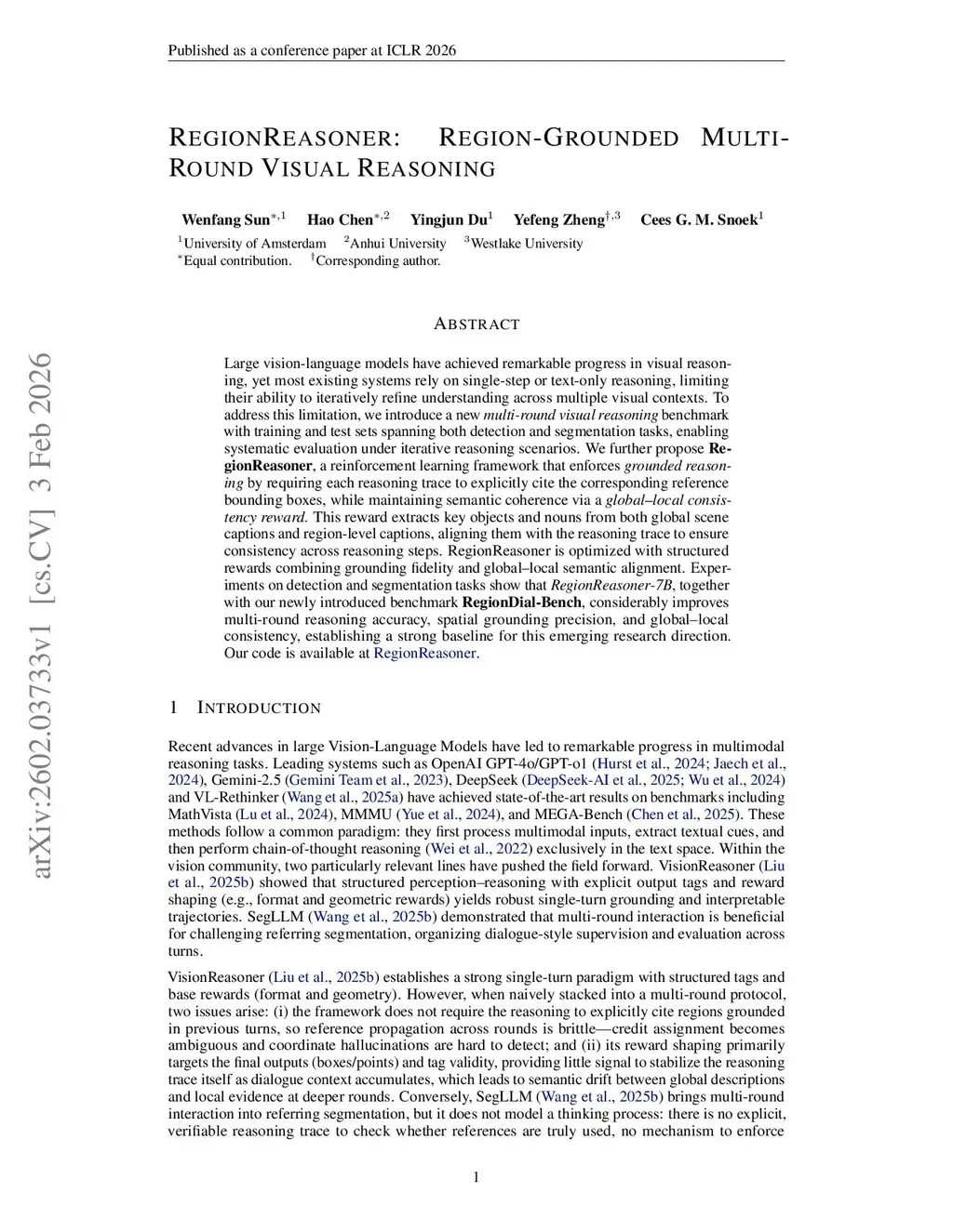 Large vision-language models have achieved remarkable progress in visual reasoning, yet most existing systems rely on single-step or text-only reasoning, limiting their ability to iteratively refine understanding across multiple visual contexts. To address this limitation, we introduce a new multi-round visual reasoning benchmark with training and test sets spanning both detection and segmentation tasks, enabling systematic evaluation under iterative reasoning scenarios. We further propose RegionReasoner, a reinforcement learning framework that enforces grounded reasoning by requiring each reasoning trace to explicitly cite the corresponding reference bounding boxes, while maintaining semantic coherence via a global-local consistency reward. This reward extracts key objects and nouns from both global scene captions and region-level captions, aligning them with the reasoning trace to ensure consistency across reasoning steps. RegionReasoner is optimized with structured rewards combining grounding fidelity and global-local semantic alignment. Experiments on detection and segmentation tasks show that RegionReasoner-7B, together with our newly introduced benchmark RegionDial-Bench, considerably improves multi-round reasoning accuracy, spatial grounding precision, and global-local consistency, establishing a strong baseline for this emerging research direction.