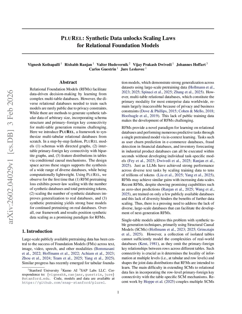 Relational Foundation Models (RFMs) facilitate data-driven decision-making by learning from complex multi-table databases. However, the diverse relational databases needed to train such models are rarely public due to privacy constraints. While there are methods to generate synthetic tabular data of arbitrary size, incorporating schema structure and primary--foreign key connectivity for multi-table generation remains challenging. Here we introduce PluRel, a framework to synthesize multi-tabular relational databases from scratch. In a step-by-step fashion, PluRel models (1) schemas with directed graphs, (2) inter-table primary-foreign key connectivity with bipartite graphs, and, (3) feature distributions in tables via conditional causal mechanisms. The design space across these stages supports the synthesis of a wide range of diverse databases, while being computationally lightweight. Using PluRel, we observe for the first time that (1) RFM pretraining loss exhibits power-law scaling with the number of synthetic databases and total pretraining tokens, (2) scaling the number of synthetic databases improves generalization to real databases, and (3) synthetic pretraining yields strong base models for continued pretraining on real databases. Overall, our framework and results position synthetic data scaling as a promising paradigm for RFMs.