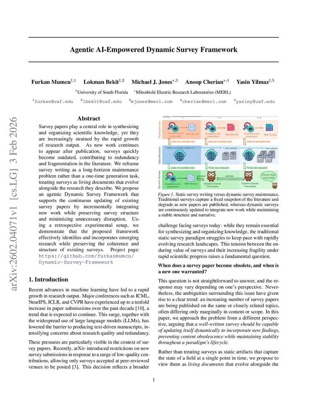 Survey papers play a central role in synthesizing and organizing scientific knowledge, yet they are increasingly strained by the rapid growth of research output. As new work continues to appear after publication, surveys quickly become outdated, contributing to redundancy and fragmentation in the literature. We reframe survey writing as a long-horizon maintenance problem rather than a one-time generation task, treating surveys as living documents that evolve alongside the research they describe. We propose an agentic Dynamic Survey Framework that supports the continuous updating of existing survey papers by incrementally integrating new work while preserving survey structure and minimizing unnecessary disruption. Using a retrospective experimental setup, we demonstrate that the proposed framework effectively identifies and incorporates emerging research while preserving the coherence and structure of existing surveys.