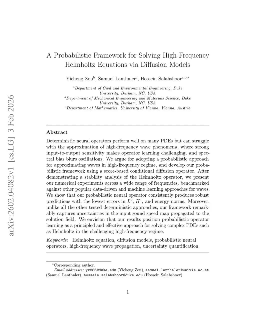 Deterministic neural operators perform well on many PDEs but can struggle with the approximation of high-frequency wave phenomena, where strong input-to-output sensitivity makes operator learning challenging, and spectral bias blurs oscillations. We argue for adopting a probabilistic approach for approximating waves in high-frequency regime, and develop our probabilistic framework using a score-based conditional diffusion operator. After demonstrating a stability analysis of the Helmholtz operator, we present our numerical experiments across a wide range of frequencies, benchmarked against other popular data-driven and machine learning approaches for waves. We show that our probabilistic neural operator consistently produces robust predictions with the lowest errors in , , and energy norms. Moreover, unlike all the other tested deterministic approaches, our framework remarkably captures uncertainties in the input sound speed map propagated to the solution field. We envision that our results position probabilistic operator learning as a principled and effective approach for solving complex PDEs such as Helmholtz in the challenging high-frequency regime.