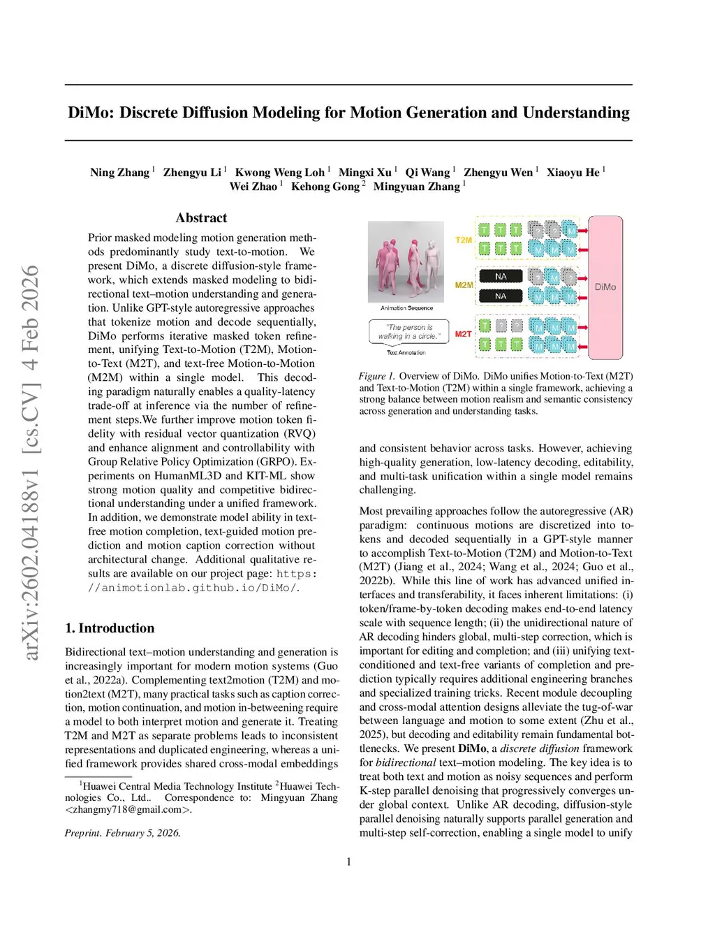 Prior masked modeling motion generation methods predominantly study text-to-motion. We present DiMo, a discrete diffusion-style framework, which extends masked modeling to bidirectional text--motion understanding and generation. Unlike GPT-style autoregressive approaches that tokenize motion and decode sequentially, DiMo performs iterative masked token refinement, unifying Text-to-Motion (T2M), Motion-to-Text (M2T), and text-free Motion-to-Motion (M2M) within a single model. This decoding paradigm naturally enables a quality-latency trade-off at inference via the number of refinement steps. We further improve motion token fidelity with residual vector quantization (RVQ) and enhance alignment and controllability with Group Relative Policy Optimization (GRPO). Experiments on HumanML3D and KIT-ML show strong motion quality and competitive bidirectional understanding under a unified framework. In addition, we demonstrate model ability in text-free motion completion, text-guided motion prediction and motion caption correction without architectural change. Additional qualitative results are available on our project page:this https URL.