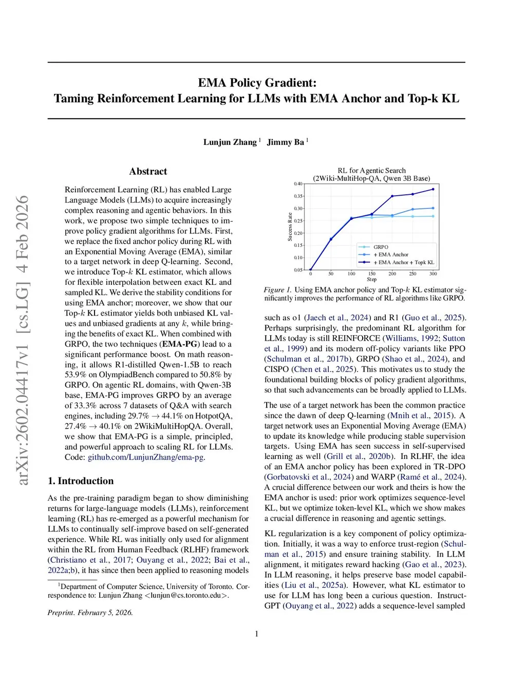 Reinforcement Learning (RL) has enabled Large Language Models (LLMs) to acquire increasingly complex reasoning and agentic behaviors. In this work, we propose two simple techniques to improve policy gradient algorithms for LLMs. First, we replace the fixed anchor policy during RL with an Exponential Moving Average (EMA), similar to a target network in deep Q-learning. Second, we introduce Top-k KL estimator, which allows for flexible interpolation between exact KL and sampled KL. We derive the stability conditions for using EMA anchor; moreover, we show that our Top-k KL estimator yields both unbiased KL values and unbiased gradients at any k, while bringing the benefits of exact KL. When combined with GRPO, the two techniques (EMA-PG) lead to a significant performance boost. On math reasoning, it allows R1-distilled Qwen-1.5B to reach 53.9% on OlympiadBench compared to 50.8% by GRPO. On agentic RL domains, with Qwen-3B base, EMA-PG improves GRPO by an average of 33.3% across 7 datasets of Q&A with search engines, including 29.7% 44.1% on HotpotQA, 27.4% 40.1% on 2WikiMultiHopQA. Overall, we show that EMA-PG is a simple, principled, and powerful approach to scaling RL for LLMs. Code:this https URL
