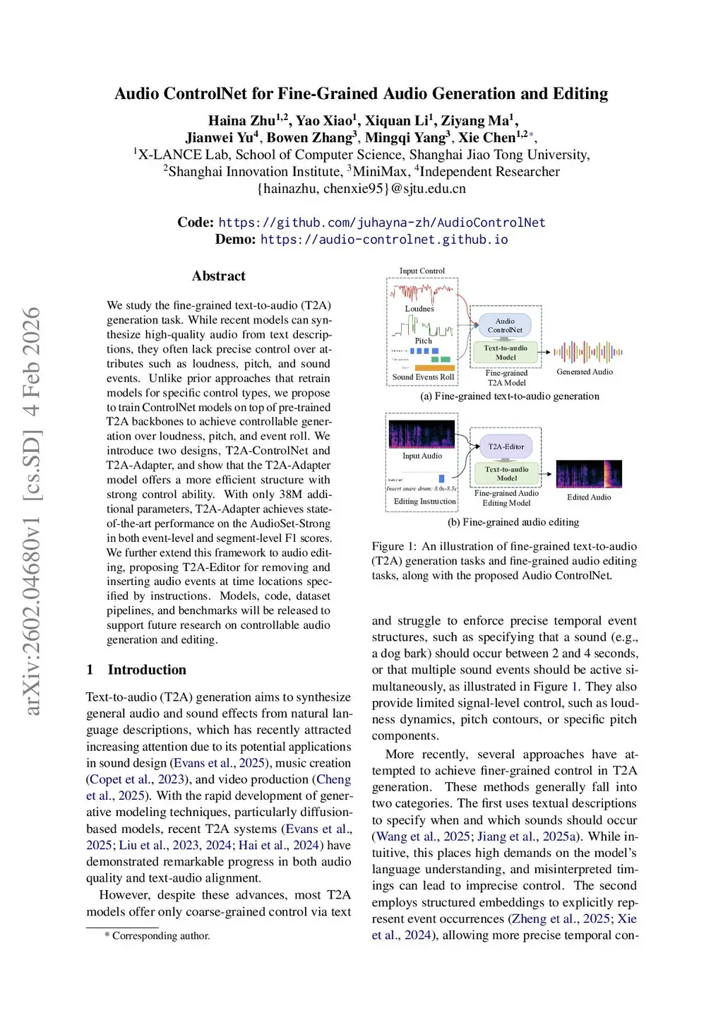 We study the fine-grained text-to-audio (T2A) generation task. While recent models can synthesize high-quality audio from text descriptions, they often lack precise control over attributes such as loudness, pitch, and sound events. Unlike prior approaches that retrain models for specific control types, we propose to train ControlNet models on top of pre-trained T2A backbones to achieve controllable generation over loudness, pitch, and event roll. We introduce two designs, T2A-ControlNet and T2A-Adapter, and show that the T2A-Adapter model offers a more efficient structure with strong control ability. With only 38M additional parameters, T2A-Adapter achieves state-of-the-art performance on the AudioSet-Strong in both event-level and segment-level F1 scores. We further extend this framework to audio editing, proposing T2A-Editor for removing and inserting audio events at time locations specified by instructions. Models, code, dataset pipelines, and benchmarks will be released to support future research on controllable audio generation and editing.