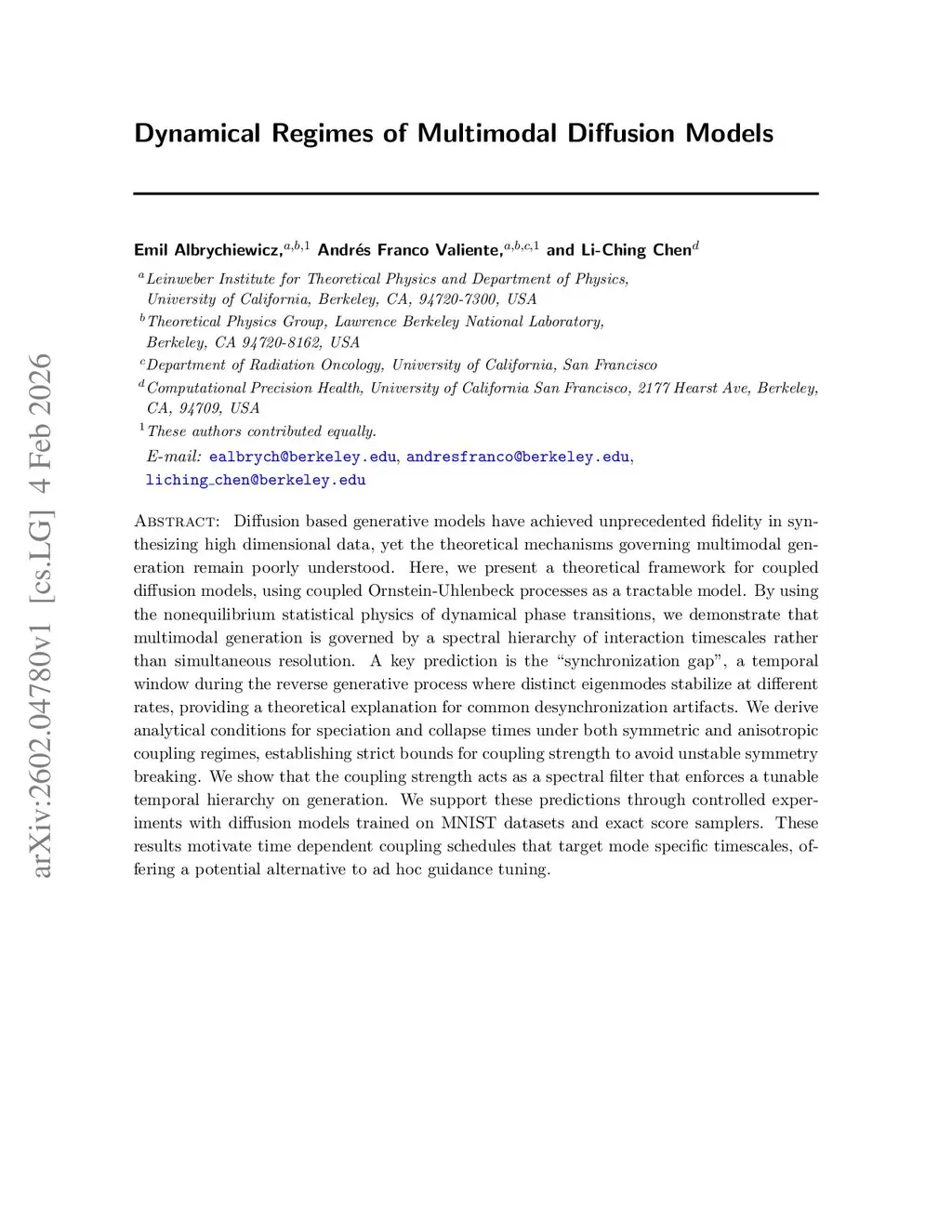 Diffusion based generative models have achieved unprecedented fidelity in synthesizing high dimensional data, yet the theoretical mechanisms governing multimodal generation remain poorly understood. Here, we present a theoretical framework for coupled diffusion models, using coupled Ornstein-Uhlenbeck processes as a tractable model. By using the nonequilibrium statistical physics of dynamical phase transitions, we demonstrate that multimodal generation is governed by a spectral hierarchy of interaction timescales rather than simultaneous resolution. A key prediction is the ``synchronization gap'', a temporal window during the reverse generative process where distinct eigenmodes stabilize at different rates, providing a theoretical explanation for common desynchronization artifacts. We derive analytical conditions for speciation and collapse times under both symmetric and anisotropic coupling regimes, establishing strict bounds for coupling strength to avoid unstable symmetry breaking. We show that the coupling strength acts as a spectral filter that enforces a tunable temporal hierarchy on generation. We support these predictions through controlled experiments with diffusion models trained on MNIST datasets and exact score samplers. These results motivate time dependent coupling schedules that target mode specific timescales, offering a potential alternative to ad hoc guidance tuning.