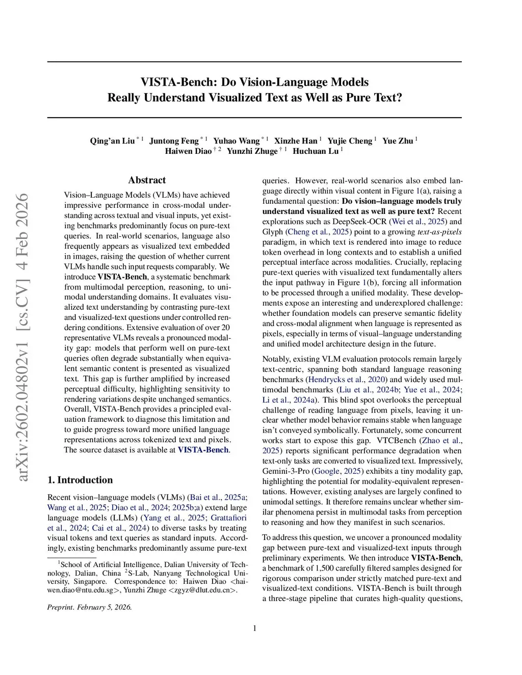 Vision-Language Models (VLMs) have achieved impressive performance in cross-modal understanding across textual and visual inputs, yet existing benchmarks predominantly focus on pure-text queries. In real-world scenarios, language also frequently appears as visualized text embedded in images, raising the question of whether current VLMs handle such input requests comparably. We introduce VISTA-Bench, a systematic benchmark from multimodal perception, reasoning, to unimodal understanding domains. It evaluates visualized text understanding by contrasting pure-text and visualized-text questions under controlled rendering conditions. Extensive evaluation of over 20 representative VLMs reveals a pronounced modality gap: models that perform well on pure-text queries often degrade substantially when equivalent semantic content is presented as visualized text. This gap is further amplified by increased perceptual difficulty, highlighting sensitivity to rendering variations despite unchanged semantics. Overall, VISTA-Bench provides a principled evaluation framework to diagnose this limitation and to guide progress toward more unified language representations across tokenized text and pixels. The source dataset is available atthis https URL.