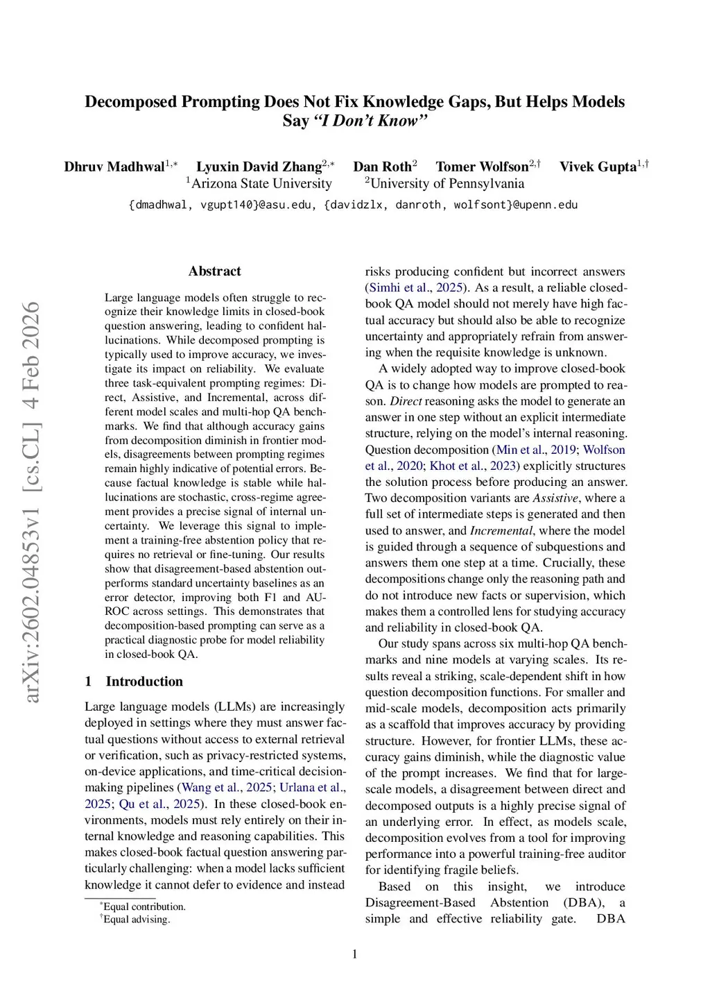 Large language models often struggle to recognize their knowledge limits in closed-book question answering, leading to confident hallucinations. While decomposed prompting is typically used to improve accuracy, we investigate its impact on reliability. We evaluate three task-equivalent prompting regimes: Direct, Assistive, and Incremental, across different model scales and multi-hop QA benchmarks. We find that although accuracy gains from decomposition diminish in frontier models, disagreements between prompting regimes remain highly indicative of potential errors. Because factual knowledge is stable while hallucinations are stochastic, cross-regime agreement provides a precise signal of internal uncertainty. We leverage this signal to implement a training-free abstention policy that requires no retrieval or fine-tuning. Our results show that disagreement-based abstention outperforms standard uncertainty baselines as an error detector, improving both F1 and AUROC across settings. This demonstrates that decomposition-based prompting can serve as a practical diagnostic probe for model reliability in closed-book QA.