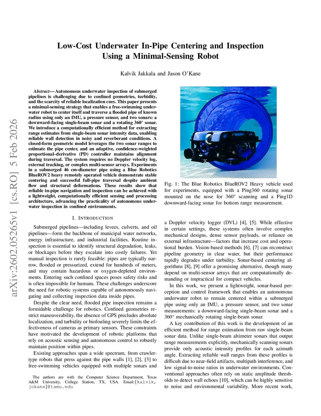 Low-Cost Underwater In-Pipe Centering and Inspection Using a Minimal-Sensing Robot