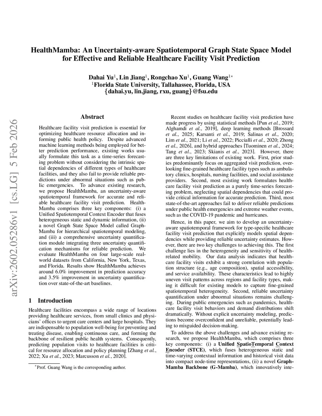 Healthcare facility visit prediction is essential for optimizing healthcare resource allocation and informing public health policy. Despite advanced machine learning methods being employed for better prediction performance, existing works usually formulate this task as a time-series forecasting problem without considering the intrinsic spatial dependencies of different types of healthcare facilities, and they also fail to provide reliable predictions under abnormal situations such as public emergencies. To advance existing research, we propose HealthMamba, an uncertainty-aware spatiotemporal framework for accurate and reliable healthcare facility visit prediction. HealthMamba comprises three key components: (i) a Unified Spatiotemporal Context Encoder that fuses heterogeneous static and dynamic information, (ii) a novel Graph State Space Model called GraphMamba for hierarchical spatiotemporal modeling, and (iii) a comprehensive uncertainty quantification module integrating three uncertainty quantification mechanisms for reliable prediction. We evaluate HealthMamba on four large-scale real-world datasets from California, New York, Texas, and Florida. Results show HealthMamba achieves around 6.0% improvement in prediction accuracy and 3.5% improvement in uncertainty quantification over state-of-the-art baselines.