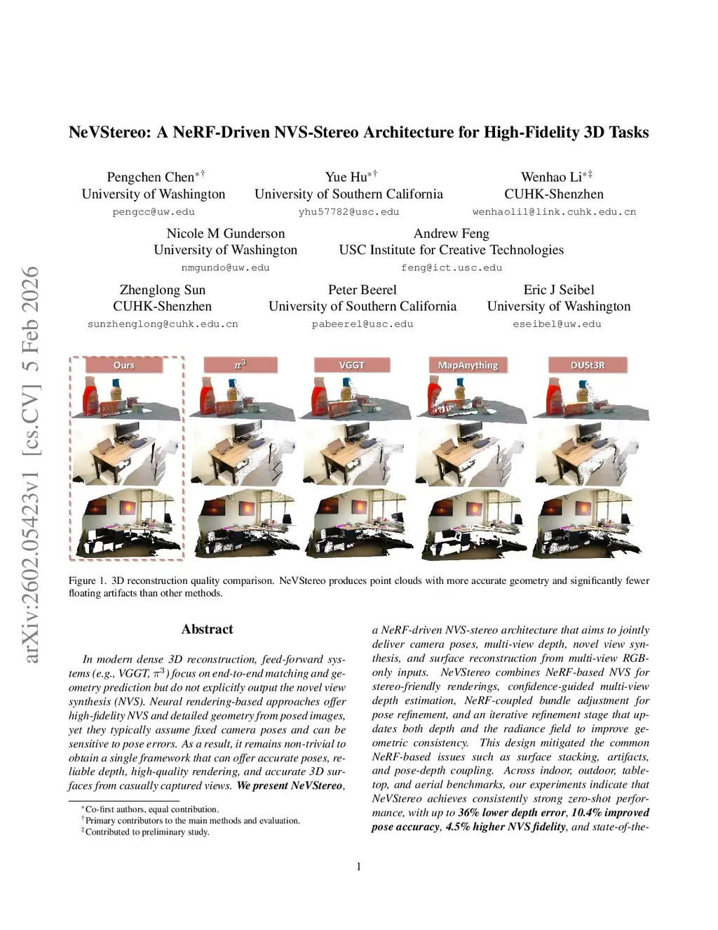 In modern dense 3D reconstruction, feed-forward systems (e.g., VGGT, pi3) focus on end-to-end matching and geometry prediction but do not explicitly output the novel view synthesis (NVS). Neural rendering-based approaches offer high-fidelity NVS and detailed geometry from posed images, yet they typically assume fixed camera poses and can be sensitive to pose errors. As a result, it remains non-trivial to obtain a single framework that can offer accurate poses, reliable depth, high-quality rendering, and accurate 3D surfaces from casually captured views. We present NeVStereo, a NeRF-driven NVS-stereo architecture that aims to jointly deliver camera poses, multi-view depth, novel view synthesis, and surface reconstruction from multi-view RGB-only inputs. NeVStereo combines NeRF-based NVS for stereo-friendly renderings, confidence-guided multi-view depth estimation, NeRF-coupled bundle adjustment for pose refinement, and an iterative refinement stage that updates both depth and the radiance field to improve geometric consistency. This design mitigated the common NeRF-based issues such as surface stacking, artifacts, and pose-depth coupling. Across indoor, outdoor, tabletop, and aerial benchmarks, our experiments indicate that NeVStereo achieves consistently strong zero-shot performance, with up to 36% lower depth error, 10.4% improved pose accuracy, 4.5% higher NVS fidelity, and state-of-the-art mesh quality (F1 91.93%, Chamfer 4.35 mm) compared to existing prestigious methods.