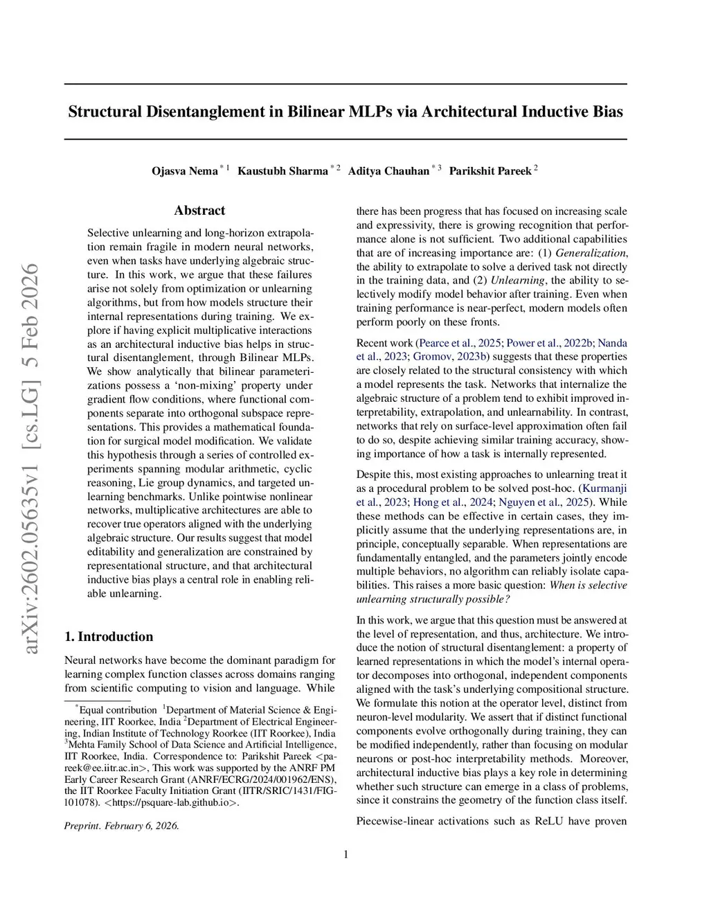 Selective unlearning and long-horizon extrapolation remain fragile in modern neural networks, even when tasks have underlying algebraic structure. In this work, we argue that these failures arise not solely from optimization or unlearning algorithms, but from how models structure their internal representations during training. We explore if having explicit multiplicative interactions as an architectural inductive bias helps in structural disentanglement, through Bilinear MLPs. We show analytically that bilinear parameterizations possess a `non-mixing' property under gradient flow conditions, where functional components separate into orthogonal subspace representations. This provides a mathematical foundation for surgical model modification. We validate this hypothesis through a series of controlled experiments spanning modular arithmetic, cyclic reasoning, Lie group dynamics, and targeted unlearning benchmarks. Unlike pointwise nonlinear networks, multiplicative architectures are able to recover true operators aligned with the underlying algebraic structure. Our results suggest that model editability and generalization are constrained by representational structure, and that architectural inductive bias plays a central role in enabling reliable unlearning.