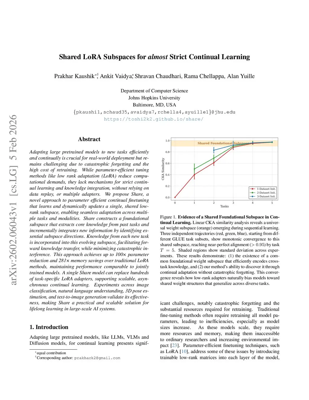 Adapting large pretrained models to new tasks efficiently and continually is crucial for real-world deployment but remains challenging due to catastrophic forgetting and the high cost of retraining. While parameter-efficient tuning methods like low rank adaptation (LoRA) reduce computational demands, they lack mechanisms for strict continual learning and knowledge integration, without relying on data replay, or multiple adapters. We propose Share, a novel approach to parameter efficient continual finetuning that learns and dynamically updates a single, shared low-rank subspace, enabling seamless adaptation across multiple tasks and modalities. Share constructs a foundational subspace that extracts core knowledge from past tasks and incrementally integrates new information by identifying essential subspace directions. Knowledge from each new task is incorporated into this evolving subspace, facilitating forward knowledge transfer, while minimizing catastrophic interference. This approach achieves up to 100x parameter reduction and 281x memory savings over traditional LoRA methods, maintaining performance comparable to jointly trained models. A single Share model can replace hundreds of task-specific LoRA adapters, supporting scalable, asynchronous continual learning. Experiments across image classification, natural language understanding, 3D pose estimation, and text-to-image generation validate its effectiveness, making Share a practical and scalable solution for lifelong learning in large-scale AI systems.