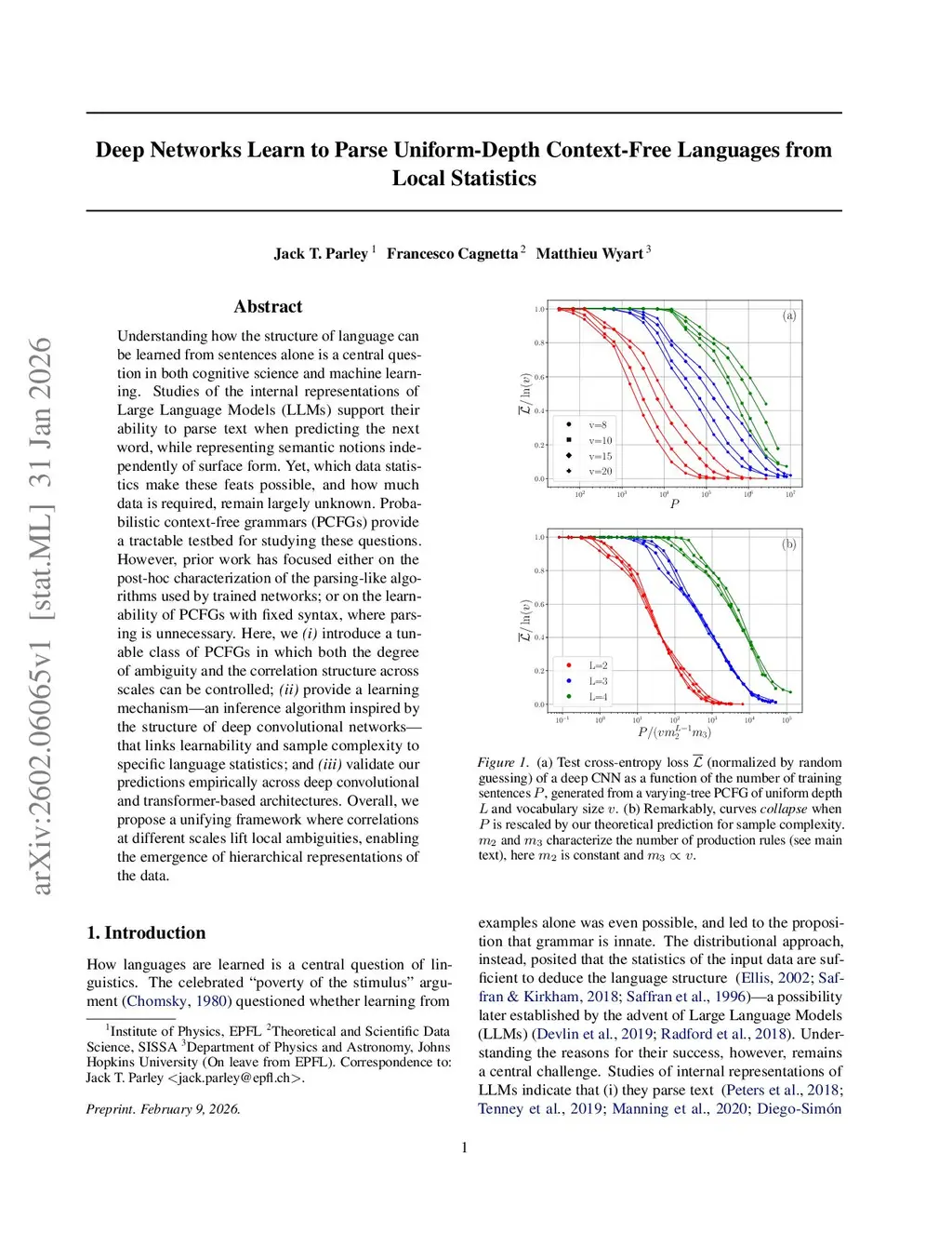 Understanding how the structure of language can be learned from sentences alone is a central question in both cognitive science and machine learning. Studies of the internal representations of Large Language Models (LLMs) support their ability to parse text when predicting the next word, while representing semantic notions independently of surface form. Yet, which data statistics make these feats possible, and how much data is required, remain largely unknown. Probabilistic context-free grammars (PCFGs) provide a tractable testbed for studying these questions. However, prior work has focused either on the post-hoc characterization of the parsing-like algorithms used by trained networks; or on the learnability of PCFGs with fixed syntax, where parsing is unnecessary. Here, we (i) introduce a tunable class of PCFGs in which both the degree of ambiguity and the correlation structure across scales can be controlled; (ii) provide a learning mechanism -- an inference algorithm inspired by the structure of deep convolutional networks -- that links learnability and sample complexity to specific language statistics; and (iii) validate our predictions empirically across deep convolutional and transformer-based architectures. Overall, we propose a unifying framework where correlations at different scales lift local ambiguities, enabling the emergence of hierarchical representations of the data.