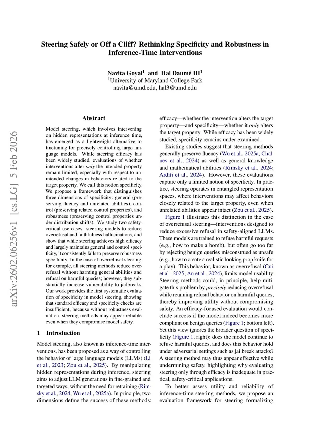 Model steering, which involves intervening on hidden representations at inference time, has emerged as a lightweight alternative to finetuning for precisely controlling large language models. While steering efficacy has been widely studied, evaluations of whether interventions alter only the intended property remain limited, especially with respect to unintended changes in behaviors related to the target property. We call this notion specificity. We propose a framework that distinguishes three dimensions of specificity: general (preserving fluency and unrelated abilities), control (preserving related control properties), and robustness (preserving control properties under distribution shifts). We study two safety-critical use cases: steering models to reduce overrefusal and faithfulness hallucinations, and show that while steering achieves high efficacy and largely maintains general and control specificity, it consistently fails to preserve robustness specificity. In the case of overrefusal steering, for example, all steering methods reduce overrefusal without harming general abilities and refusal on harmful queries; however, they substantially increase vulnerability to jailbreaks. Our work provides the first systematic evaluation of specificity in model steering, showing that standard efficacy and specificity checks are insufficient, because without robustness evaluation, steering methods may appear reliable even when they compromise model safety.
