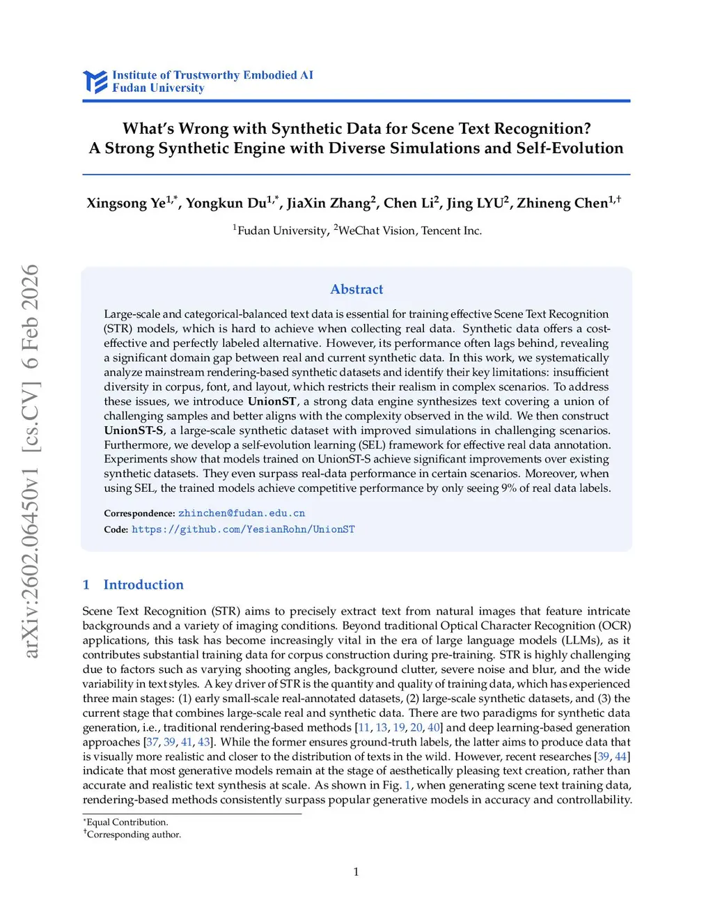 Large-scale and categorical-balanced text data is essential for training effective Scene Text Recognition (STR) models, which is hard to achieve when collecting real data. Synthetic data offers a cost-effective and perfectly labeled alternative. However, its performance often lags behind, revealing a significant domain gap between real and current synthetic data. In this work, we systematically analyze mainstream rendering-based synthetic datasets and identify their key limitations: insufficient diversity in corpus, font, and layout, which restricts their realism in complex scenarios. To address these issues, we introduce UnionST, a strong data engine synthesizes text covering a union of challenging samples and better aligns with the complexity observed in the wild. We then construct UnionST-S, a large-scale synthetic dataset with improved simulations in challenging scenarios. Furthermore, we develop a self-evolution learning (SEL) framework for effective real data annotation. Experiments show that models trained on UnionST-S achieve significant improvements over existing synthetic datasets. They even surpass real-data performance in certain scenarios. Moreover, when using SEL, the trained models achieve competitive performance by only seeing 9% of real data labels. Code is available atthis https URL.