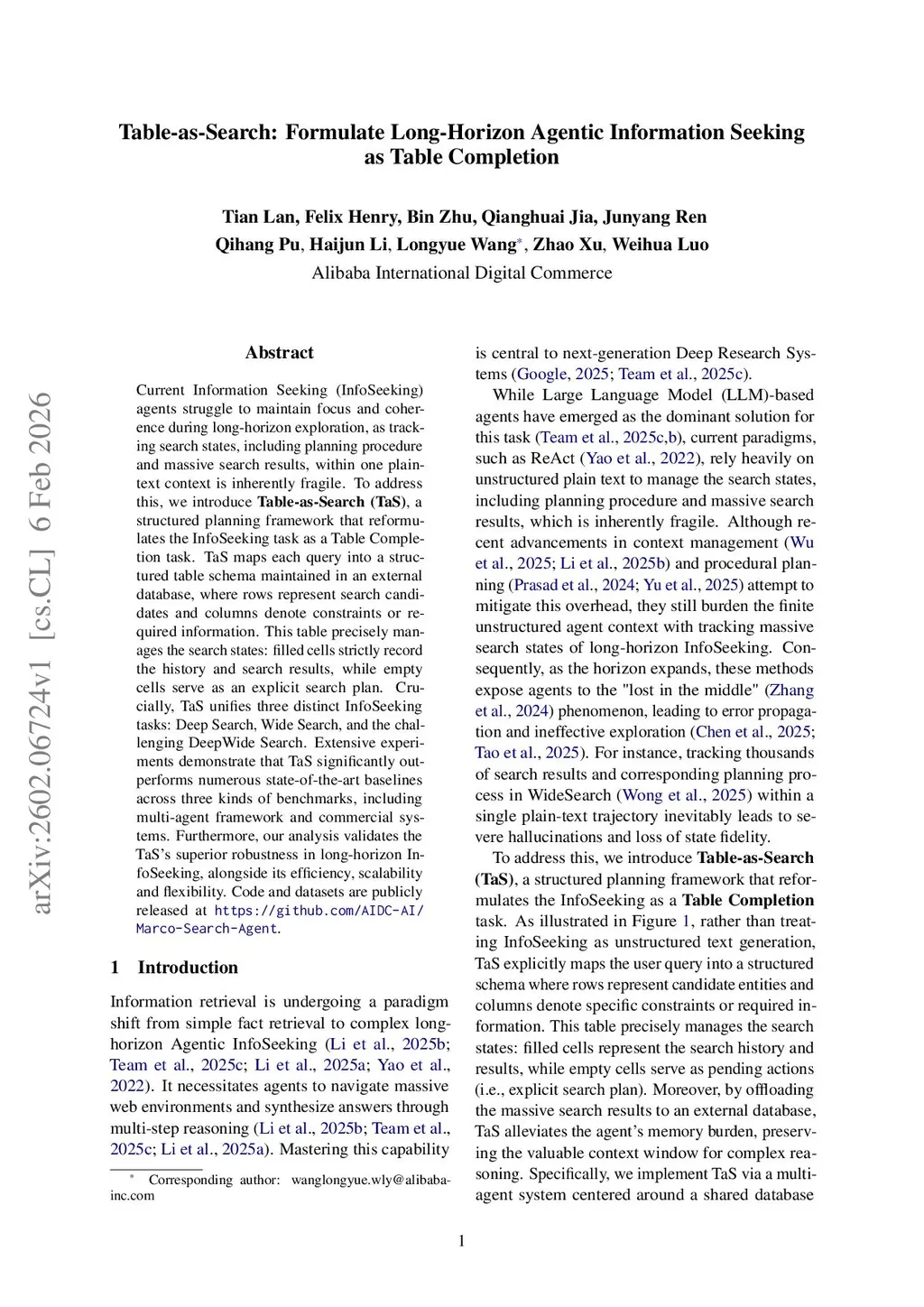 Current Information Seeking (InfoSeeking) agents struggle to maintain focus and coherence during long-horizon exploration, as tracking search states, including planning procedure and massive search results, within one plain-text context is inherently fragile. To address this, we introduce \textbf{Table-as-Search (TaS)}, a structured planning framework that reformulates the InfoSeeking task as a Table Completion task. TaS maps each query into a structured table schema maintained in an external database, where rows represent search candidates and columns denote constraints or required information. This table precisely manages the search states: filled cells strictly record the history and search results, while empty cells serve as an explicit search plan. Crucially, TaS unifies three distinct InfoSeeking tasks: Deep Search, Wide Search, and the challenging DeepWide Search. Extensive experiments demonstrate that TaS significantly outperforms numerous state-of-the-art baselines across three kinds of benchmarks, including multi-agent framework and commercial systems. Furthermore, our analysis validates the TaS's superior robustness in long-horizon InfoSeeking, alongside its efficiency, scalability and flexibility. Code and datasets are publicly released atthis https URL.
