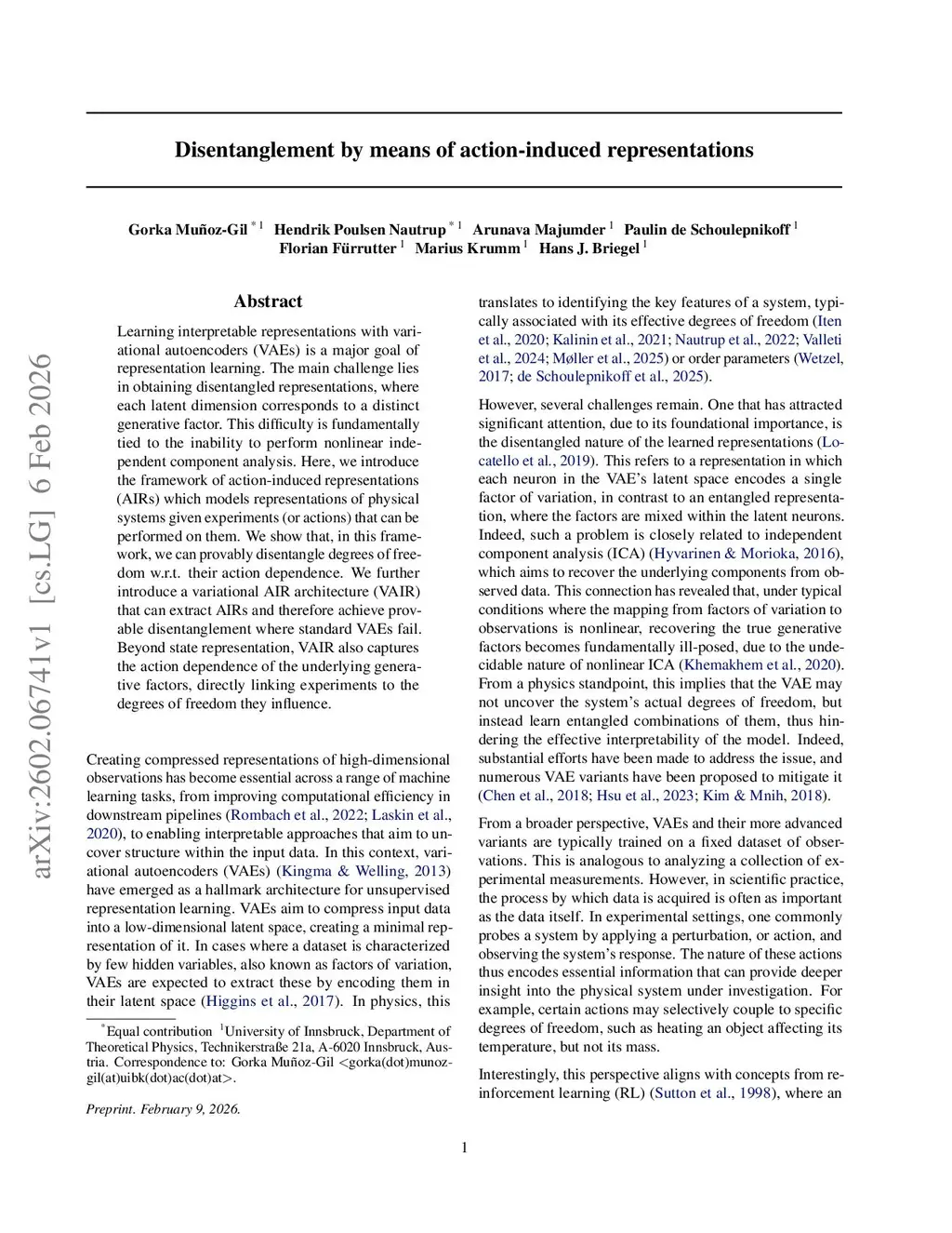 Learning interpretable representations with variational autoencoders (VAEs) is a major goal of representation learning. The main challenge lies in obtaining disentangled representations, where each latent dimension corresponds to a distinct generative factor. This difficulty is fundamentally tied to the inability to perform nonlinear independent component analysis. Here, we introduce the framework of action-induced representations (AIRs) which models representations of physical systems given experiments (or actions) that can be performed on them. We show that, in this framework, we can provably disentangle degrees of freedom w.r.t. their action dependence. We further introduce a variational AIR architecture (VAIR) that can extract AIRs and therefore achieve provable disentanglement where standard VAEs fail. Beyond state representation, VAIR also captures the action dependence of the underlying generative factors, directly linking experiments to the degrees of freedom they influence.
