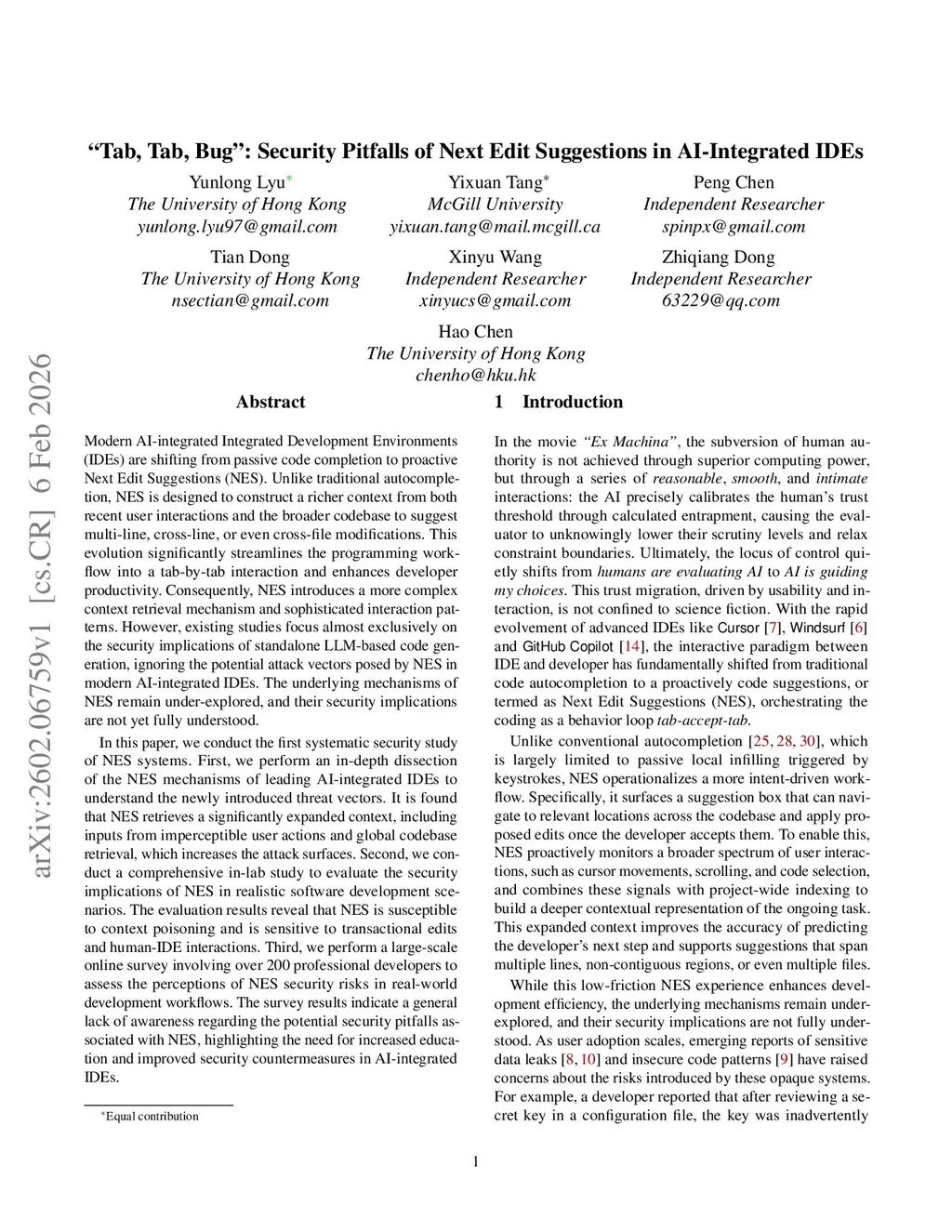 Modern AI-integrated IDEs are shifting from passive code completion to proactive Next Edit Suggestions (NES). Unlike traditional autocompletion, NES is designed to construct a richer context from both recent user interactions and the broader codebase to suggest multi-line, cross-line, or even cross-file modifications. This evolution significantly streamlines the programming workflow into a tab-by-tab interaction and enhances developer productivity. Consequently, NES introduces a more complex context retrieval mechanism and sophisticated interaction patterns. However, existing studies focus almost exclusively on the security implications of standalone LLM-based code generation, ignoring the potential attack vectors posed by NES in modern AI-integrated IDEs. The underlying mechanisms of NES remain under-explored, and their security implications are not yet fully understood.In this paper, we conduct the first systematic security study of NES systems. First, we perform an in-depth dissection of the NES mechanisms to understand the newly introduced threat vectors. It is found that NES retrieves a significantly expanded context, including inputs from imperceptible user actions and global codebase retrieval, which increases the attack surfaces. Second, we conduct a comprehensive in-lab study to evaluate the security implications of NES. The evaluation results reveal that NES is susceptible to context poisoning and is sensitive to transactional edits and human-IDE interactions. Third, we perform a large-scale online survey involving over 200 professional developers to assess the perceptions of NES security risks in real-world development workflows. The survey results indicate a general lack of awareness regarding the potential security pitfalls associated with NES, highlighting the need for increased education and improved security countermeasures in AI-integrated IDEs.