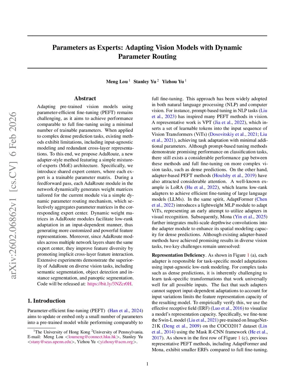 Adapting pre-trained vision models using parameter-efficient fine-tuning (PEFT) remains challenging, as it aims to achieve performance comparable to full fine-tuning using a minimal number of trainable parameters. When applied to complex dense prediction tasks, existing methods exhibit limitations, including input-agnostic modeling and redundant cross-layer representations. To this end, we propose AdaRoute, a new adapter-style method featuring a simple mixture-of-experts (MoE) architecture. Specifically, we introduce shared expert centers, where each expert is a trainable parameter matrix. During a feedforward pass, each AdaRoute module in the network dynamically generates weight matrices tailored for the current module via a simple dynamic parameter routing mechanism, which selectively aggregates parameter matrices in the corresponding expert center. Dynamic weight matrices in AdaRoute modules facilitate low-rank adaptation in an input-dependent manner, thus generating more customized and powerful feature representations. Moreover, since AdaRoute modules across multiple network layers share the same expert center, they improve feature diversity by promoting implicit cross-layer feature interaction. Extensive experiments demonstrate the superiority of AdaRoute on diverse vision tasks, including semantic segmentation, object detection and instance segmentation, and panoptic segmentation. Code will be available at:this https URL.