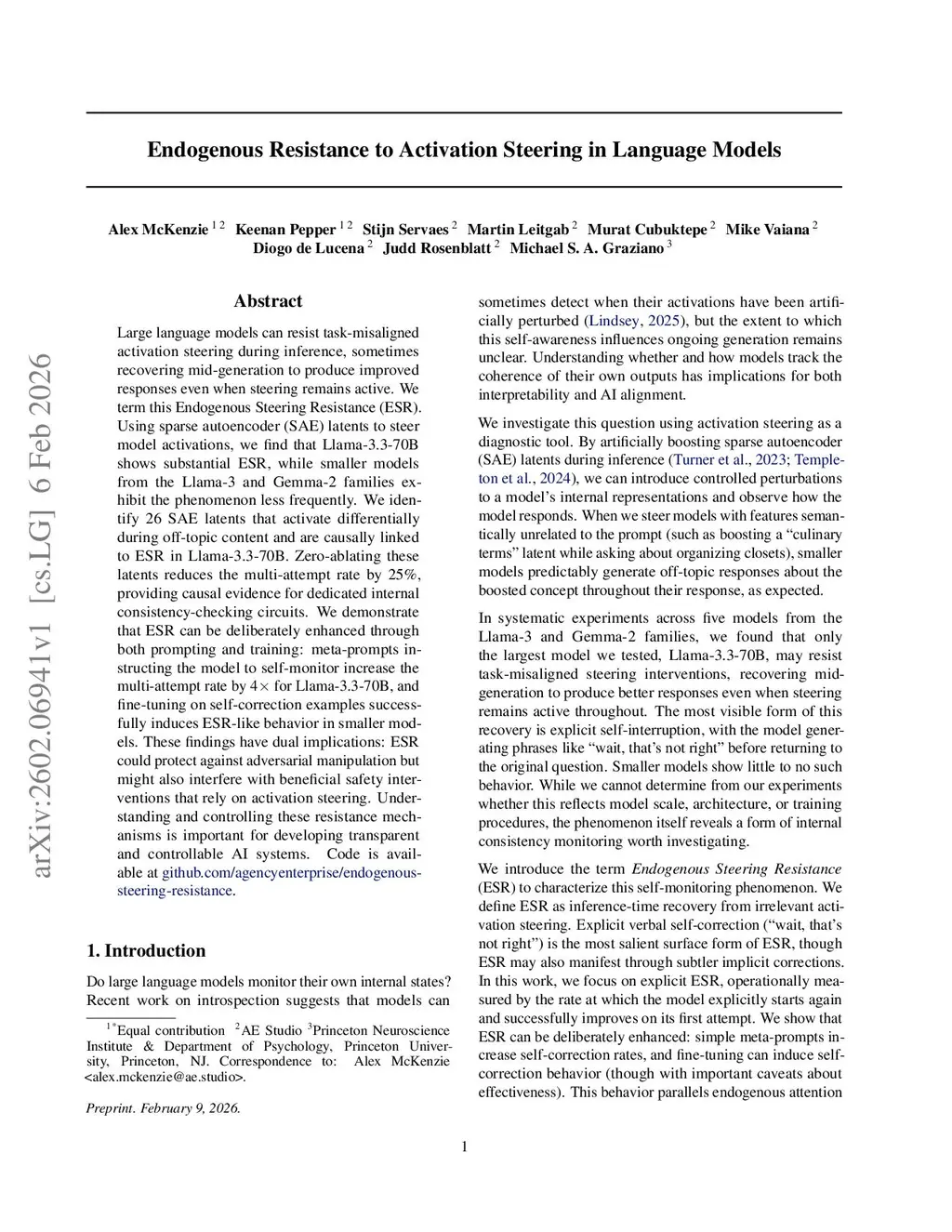Large language models can resist task-misaligned activation steering during inference, sometimes recovering mid-generation to produce improved responses even when steering remains active. We term this Endogenous Steering Resistance (ESR). Using sparse autoencoder (SAE) latents to steer model activations, we find that Llama-3.3-70B shows substantial ESR, while smaller models from the Llama-3 and Gemma-2 families exhibit the phenomenon less frequently. We identify 26 SAE latents that activate differentially during off-topic content and are causally linked to ESR in Llama-3.3-70B. Zero-ablating these latents reduces the multi-attempt rate by 25%, providing causal evidence for dedicated internal consistency-checking circuits. We demonstrate that ESR can be deliberately enhanced through both prompting and training: meta-prompts instructing the model to self-monitor increase the multi-attempt rate by 4x for Llama-3.3-70B, and fine-tuning on self-correction examples successfully induces ESR-like behavior in smaller models. These findings have dual implications: ESR could protect against adversarial manipulation but might also interfere with beneficial safety interventions that rely on activation steering. Understanding and controlling these resistance mechanisms is important for developing transparent and controllable AI systems. Code is available atthis http URL.