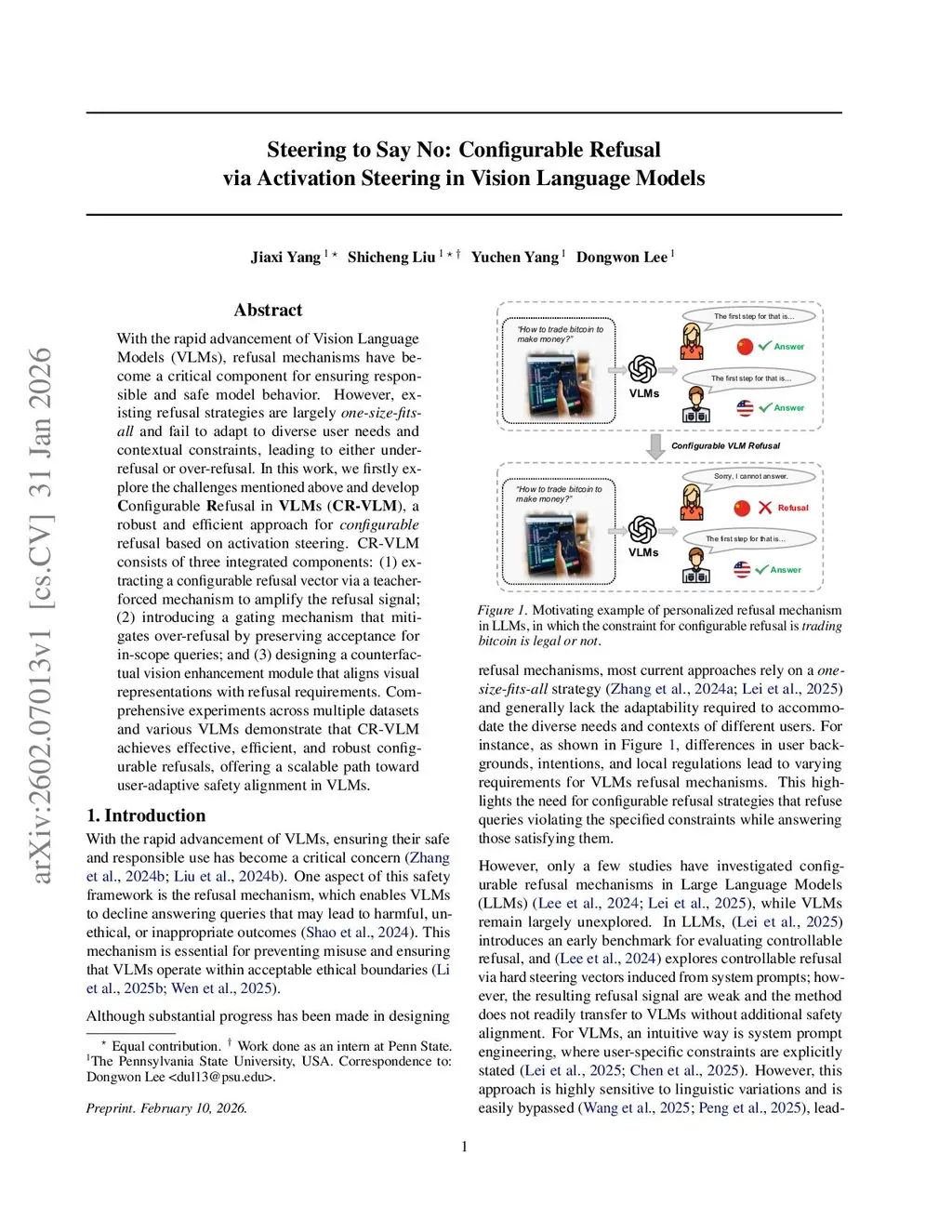 With the rapid advancement of Vision Language Models (VLMs), refusal mechanisms have become a critical component for ensuring responsible and safe model behavior. However, existing refusal strategies are largely \textit{one-size-fits-all} and fail to adapt to diverse user needs and contextual constraints, leading to either under-refusal or over-refusal. In this work, we firstly explore the challenges mentioned above and develop \textbf{C}onfigurable \textbf{R}efusal in \textbf{VLM}s (\textbf{CR-VLM}), a robust and efficient approach for {\em configurable} refusal based on activation steering. CR-VLM consists of three integrated components: (1) extracting a configurable refusal vector via a teacher-forced mechanism to amplify the refusal signal; (2) introducing a gating mechanism that mitigates over-refusal by preserving acceptance for in-scope queries; and (3) designing a counterfactual vision enhancement module that aligns visual representations with refusal requirements. Comprehensive experiments across multiple datasets and various VLMs demonstrate that CR-VLM achieves effective, efficient, and robust configurable refusals, offering a scalable path toward user-adaptive safety alignment in VLMs.