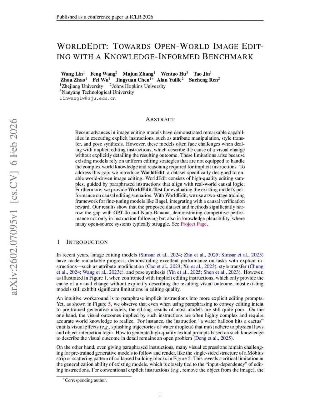 Recent advances in image editing models have demonstrated remarkable capabilities in executing explicit instructions, such as attribute manipulation, style transfer, and pose synthesis. However, these models often face challenges when dealing with implicit editing instructions, which describe the cause of a visual change without explicitly detailing the resulting outcome. These limitations arise because existing models rely on uniform editing strategies that are not equipped to handle the complex world knowledge and reasoning required for implicit instructions. To address this gap, we introduce \textbf{WorldEdit}, a dataset specifically designed to enable world-driven image editing. WorldEdit consists of high-quality editing samples, guided by paraphrased instructions that align with real-world causal logic. Furthermore, we provide \textbf{WorldEdit-Test} for evaluating the existing model's performance on causal editing scenarios. With WorldEdit, we use a two-stage training framework for fine-tuning models like Bagel, integrating with a causal verification reward. Our results show that the proposed dataset and methods significantly narrow the gap with GPT-4o and Nano-Banana, demonstrating competitive performance not only in instruction following but also in knowledge plausibility, where many open-source systems typically struggle.
