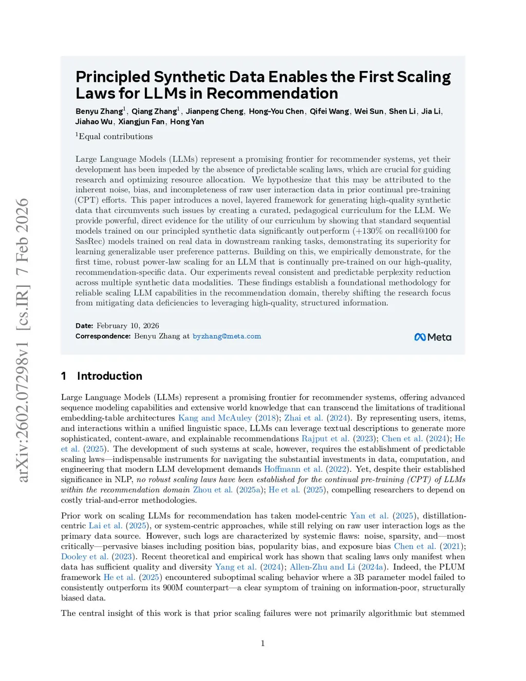 Large Language Models (LLMs) represent a promising frontier for recommender systems, yet their development has been impeded by the absence of predictable scaling laws, which are crucial for guiding research and optimizing resource allocation. We hypothesize that this may be attributed to the inherent noise, bias, and incompleteness of raw user interaction data in prior continual pre-training (CPT) efforts. This paper introduces a novel, layered framework for generating high-quality synthetic data that circumvents such issues by creating a curated, pedagogical curriculum for the LLM. We provide powerful, direct evidence for the utility of our curriculum by showing that standard sequential models trained on our principled synthetic data significantly outperform ( on recall@100 for SasRec) models trained on real data in downstream ranking tasks, demonstrating its superiority for learning generalizable user preference patterns. Building on this, we empirically demonstrate, for the first time, robust power-law scaling for an LLM that is continually pre-trained on our high-quality, recommendation-specific data. Our experiments reveal consistent and predictable perplexity reduction across multiple synthetic data modalities. These findings establish a foundational methodology for reliable scaling LLM capabilities in the recommendation domain, thereby shifting the research focus from mitigating data deficiencies to leveraging high-quality, structured information.
