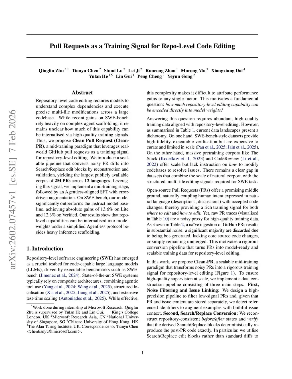 Repository-level code editing requires models to understand complex dependencies and execute precise multi-file modifications across a large codebase. While recent gains on SWE-bench rely heavily on complex agent scaffolding, it remains unclear how much of this capability can be internalised via high-quality training signals. To address this, we propose Clean Pull Request (Clean-PR), a mid-training paradigm that leverages real-world GitHub pull requests as a training signal for repository-level editing. We introduce a scalable pipeline that converts noisy pull request diffs into Search/Replace edit blocks through reconstruction and validation, resulting in the largest publicly available corpus of 2 million pull requests spanning 12 programming languages. Using this training signal, we perform a mid-training stage followed by an agentless-aligned supervised fine-tuning process with error-driven data augmentation. On SWE-bench, our model significantly outperforms the instruction-tuned baseline, achieving absolute improvements of 13.6% on SWE-bench Lite and 12.3% on SWE-bench Verified. These results demonstrate that repository-level code understanding and editing capabilities can be effectively internalised into model weights under a simplified, agentless protocol, without relying on heavy inference-time scaffolding.