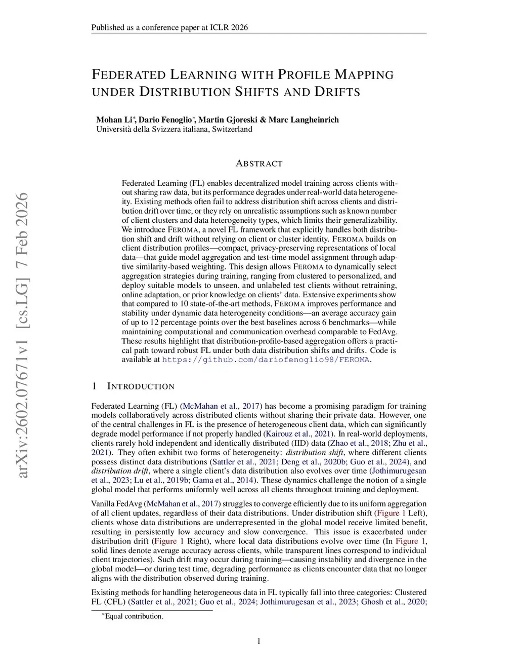 Federated Learning (FL) enables decentralized model training across clients without sharing raw data, but its performance degrades under real-world data heterogeneity. Existing methods often fail to address distribution shift across clients and distribution drift over time, or they rely on unrealistic assumptions such as known number of client clusters and data heterogeneity types, which limits their generalizability. We introduce Feroma, a novel FL framework that explicitly handles both distribution shift and drift without relying on client or cluster identity. Feroma builds on client distribution profiles-compact, privacy-preserving representations of local data-that guide model aggregation and test-time model assignment through adaptive similarity-based weighting. This design allows Feroma to dynamically select aggregation strategies during training, ranging from clustered to personalized, and deploy suitable models to unseen, and unlabeled test clients without retraining, online adaptation, or prior knowledge on clients' data. Extensive experiments show that compared to 10 state-of-the-art methods, Feroma improves performance and stability under dynamic data heterogeneity conditions-an average accuracy gain of up to 12 percentage points over the best baselines across 6 benchmarks-while maintaining computational and communication overhead comparable to FedAvg. These results highlight that distribution-profile-based aggregation offers a practical path toward robust FL under both data distribution shifts and drifts.