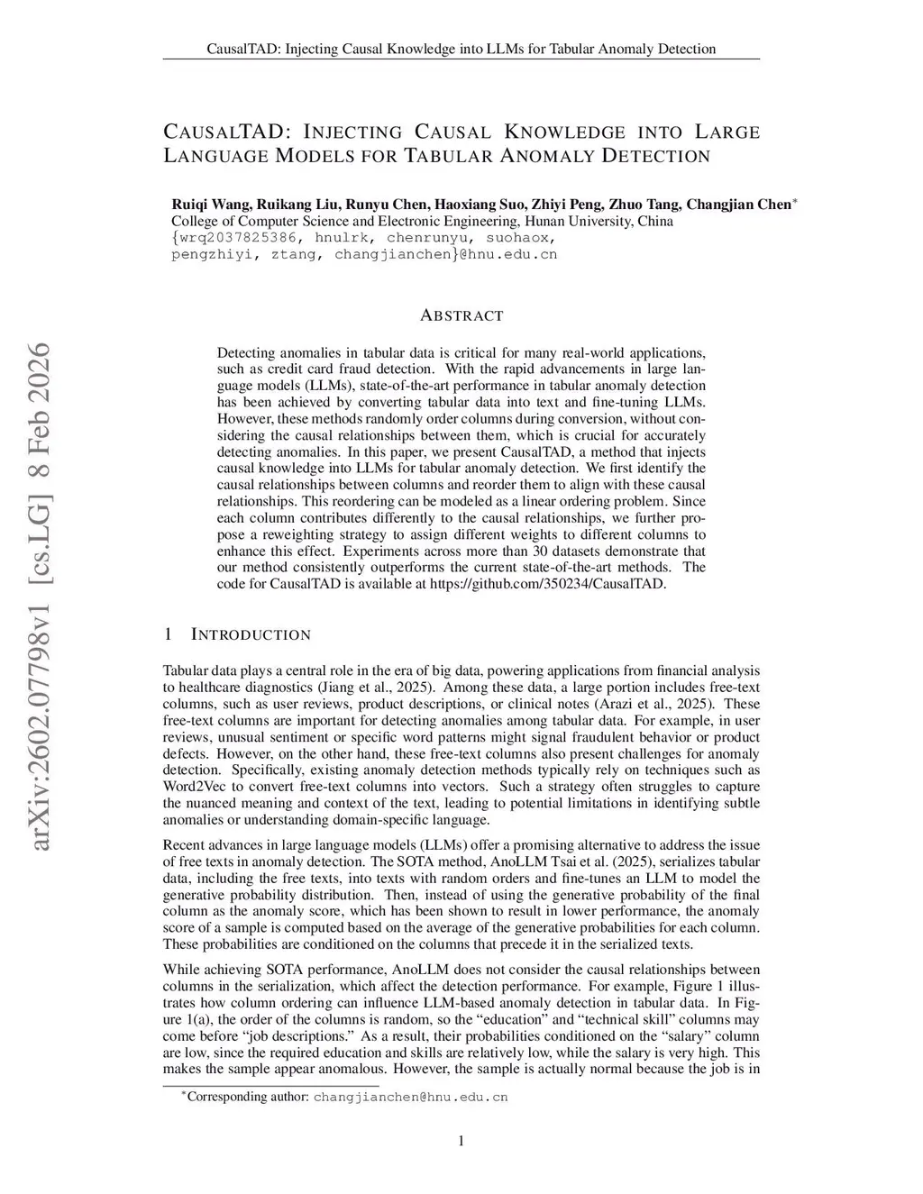 Detecting anomalies in tabular data is critical for many real-world applications, such as credit card fraud detection. With the rapid advancements in large language models (LLMs), state-of-the-art performance in tabular anomaly detection has been achieved by converting tabular data into text and fine-tuning LLMs. However, these methods randomly order columns during conversion, without considering the causal relationships between them, which is crucial for accurately detecting anomalies. In this paper, we present CausalTaD, a method that injects causal knowledge into LLMs for tabular anomaly detection. We first identify the causal relationships between columns and reorder them to align with these causal relationships. This reordering can be modeled as a linear ordering problem. Since each column contributes differently to the causal relationships, we further propose a reweighting strategy to assign different weights to different columns to enhance this effect. Experiments across more than 30 datasets demonstrate that our method consistently outperforms the current state-of-the-art methods. The code for CausalTAD is available atthis https URL.