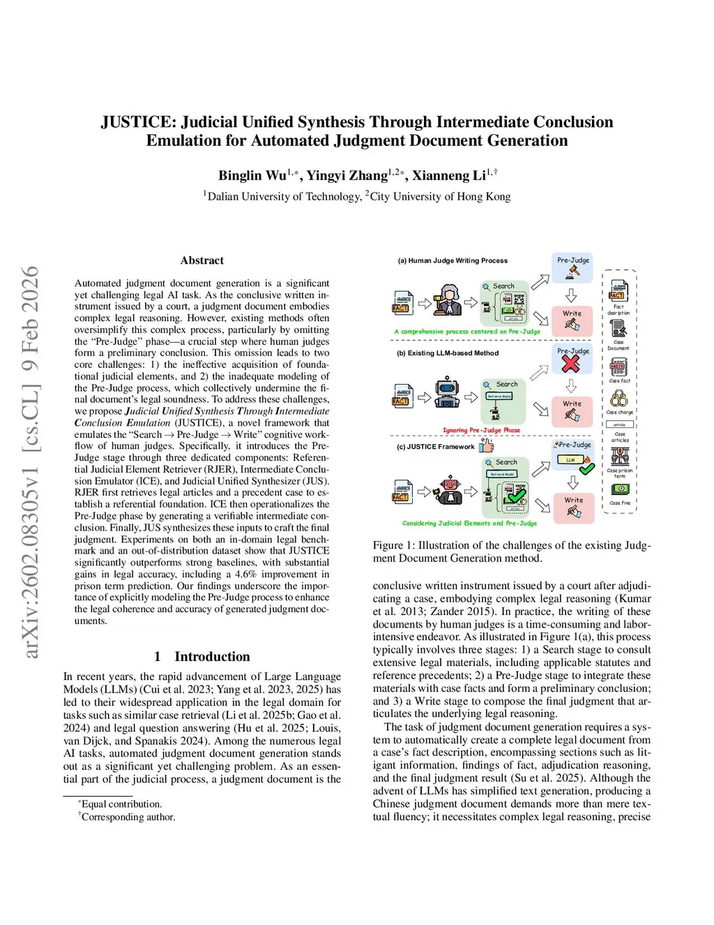 Automated judgment document generation is a significant yet challenging legal AI task. As the conclusive written instrument issued by a court, a judgment document embodies complex legal reasoning. However, existing methods often oversimplify this complex process, particularly by omitting the ``Pre-Judge'' phase, a crucial step where human judges form a preliminary conclusion. This omission leads to two core challenges: 1) the ineffective acquisition of foundational judicial elements, and 2) the inadequate modeling of the Pre-Judge process, which collectively undermine the final document's legal soundness. To address these challenges, we propose \textit{\textbf{J}udicial \textbf{U}nified \textbf{S}ynthesis \textbf{T}hrough \textbf{I}ntermediate \textbf{C}onclusion \textbf{E}mulation} (JUSTICE), a novel framework that emulates the ``Search Pre-Judge Write'' cognitive workflow of human judges. Specifically, it introduces the Pre-Judge stage through three dedicated components: Referential Judicial Element Retriever (RJER), Intermediate Conclusion Emulator (ICE), and Judicial Unified Synthesizer (JUS). RJER first retrieves legal articles and a precedent case to establish a referential foundation. ICE then operationalizes the Pre-Judge phase by generating a verifiable intermediate conclusion. Finally, JUS synthesizes these inputs to craft the final judgment. Experiments on both an in-domain legal benchmark and an out-of-distribution dataset show that JUSTICE significantly outperforms strong baselines, with substantial gains in legal accuracy, including a 4.6\% improvement in prison term prediction. Our findings underscore the importance of explicitly modeling the Pre-Judge process to enhance the legal coherence and accuracy of generated judgment documents.