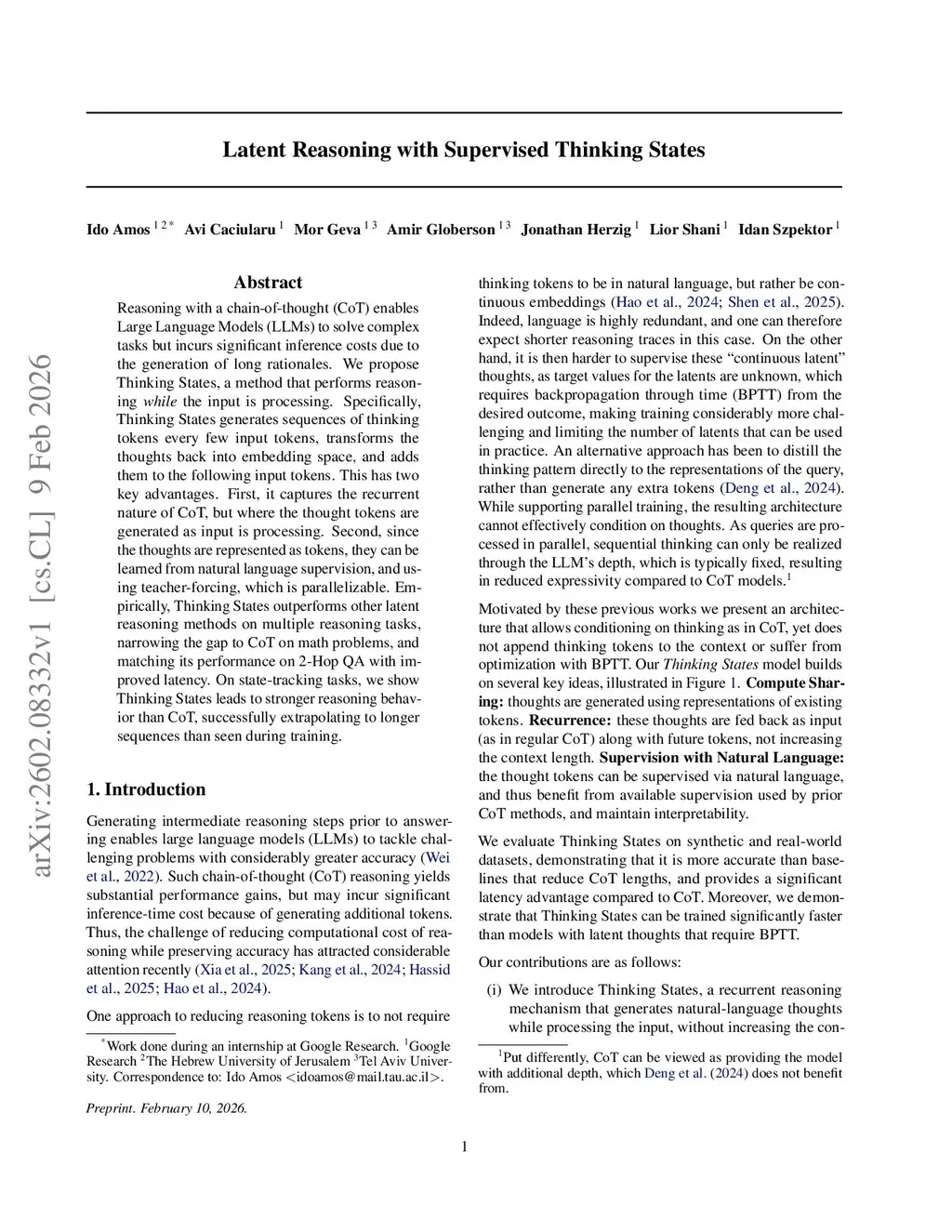 Reasoning with a chain-of-thought (CoT) enables Large Language Models (LLMs) to solve complex tasks but incurs significant inference costs due to the generation of long rationales. We propose Thinking States, a method that performs reasoning {\em while} the input is processing. Specifically, Thinking States generates sequences of thinking tokens every few input tokens, transforms the thoughts back into embedding space, and adds them to the following input tokens. This has two key advantages. First, it captures the recurrent nature of CoT, but where the thought tokens are generated as input is processing. Second, since the thoughts are represented as tokens, they can be learned from natural language supervision, and using teacher-forcing, which is parallelizable. Empirically, Thinking States outperforms other latent reasoning methods on multiple reasoning tasks, narrowing the gap to CoT on math problems, and matching its performance on 2-Hop QA with improved latency. On state-tracking tasks, we show Thinking States leads to stronger reasoning behavior than CoT, successfully extrapolating to longer sequences than seen during training.