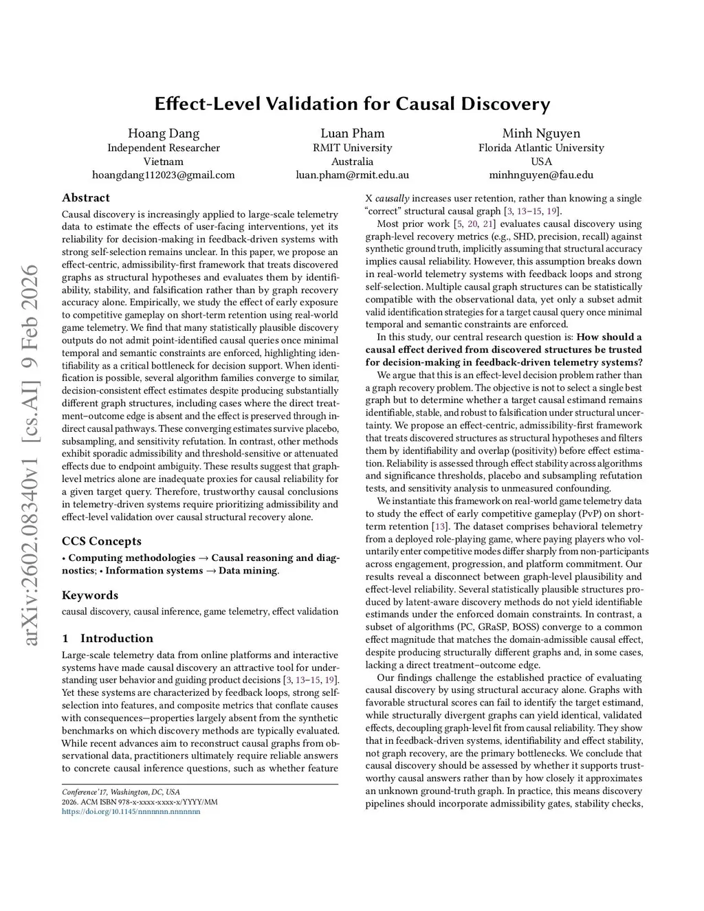 Causal discovery is increasingly applied to large-scale telemetry data to estimate the effects of user-facing interventions, yet its reliability for decision-making in feedback-driven systems with strong self-selection remains unclear. In this paper, we propose an effect-centric, admissibility-first framework that treats discovered graphs as structural hypotheses and evaluates them by identifiability, stability, and falsification rather than by graph recovery accuracy alone. Empirically, we study the effect of early exposure to competitive gameplay on short-term retention using real-world game telemetry. We find that many statistically plausible discovery outputs do not admit point-identified causal queries once minimal temporal and semantic constraints are enforced, highlighting identifiability as a critical bottleneck for decision support. When identification is possible, several algorithm families converge to similar, decision-consistent effect estimates despite producing substantially different graph structures, including cases where the direct treatment-outcome edge is absent and the effect is preserved through indirect causal pathways. These converging estimates survive placebo, subsampling, and sensitivity refutation. In contrast, other methods exhibit sporadic admissibility and threshold-sensitive or attenuated effects due to endpoint ambiguity. These results suggest that graph-level metrics alone are inadequate proxies for causal reliability for a given target query. Therefore, trustworthy causal conclusions in telemetry-driven systems require prioritizing admissibility and effect-level validation over causal structural recovery alone.