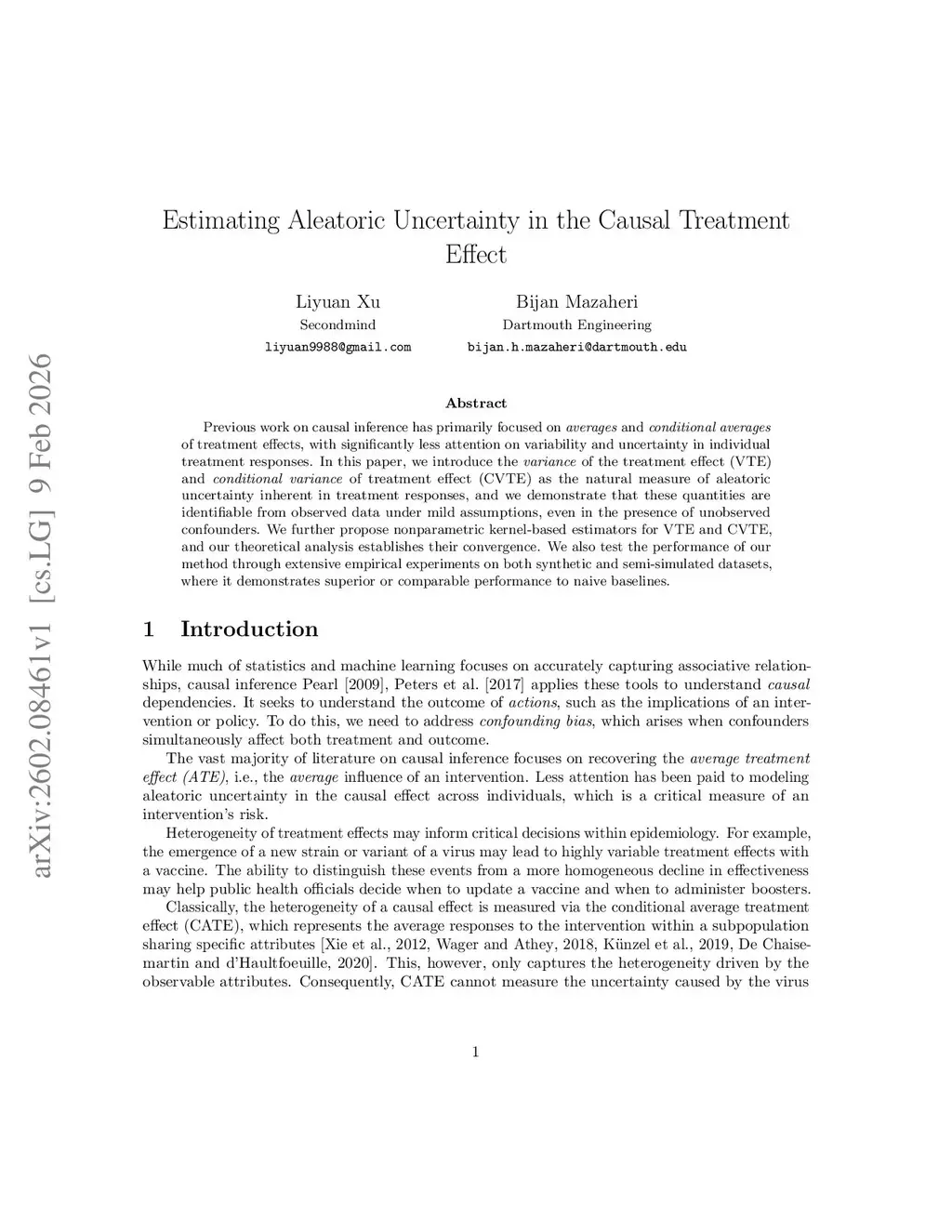 Previous work on causal inference has primarily focused on averages and conditional averages of treatment effects, with significantly less attention on variability and uncertainty in individual treatment responses. In this paper, we introduce the variance of the treatment effect (VTE) and conditional variance of treatment effect (CVTE) as the natural measure of aleatoric uncertainty inherent in treatment responses, and we demonstrate that these quantities are identifiable from observed data under mild assumptions, even in the presence of unobserved confounders. We further propose nonparametric kernel-based estimators for VTE and CVTE, and our theoretical analysis establishes their convergence. We also test the performance of our method through extensive empirical experiments on both synthetic and semi-simulated datasets, where it demonstrates superior or comparable performance to naive baselines.