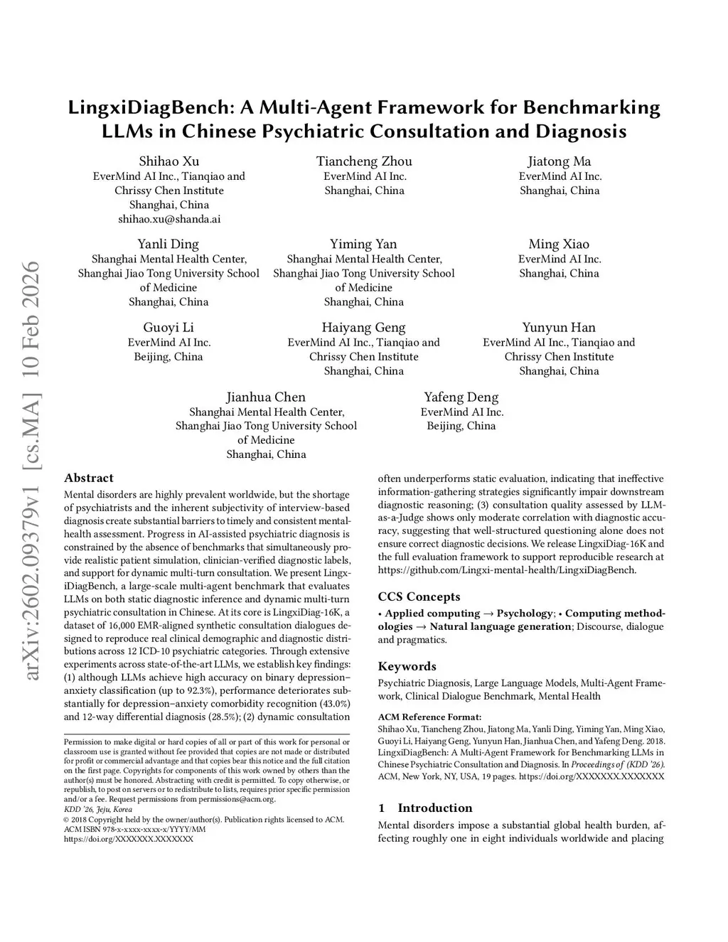 Mental disorders are highly prevalent worldwide, but the shortage of psychiatrists and the inherent subjectivity of interview-based diagnosis create substantial barriers to timely and consistent mental-health assessment. Progress in AI-assisted psychiatric diagnosis is constrained by the absence of benchmarks that simultaneously provide realistic patient simulation, clinician-verified diagnostic labels, and support for dynamic multi-turn consultation. We present LingxiDiagBench, a large-scale multi-agent benchmark that evaluates LLMs on both static diagnostic inference and dynamic multi-turn psychiatric consultation in Chinese. At its core is LingxiDiag-16K, a dataset of 16,000 EMR-aligned synthetic consultation dialogues designed to reproduce real clinical demographic and diagnostic distributions across 12 ICD-10 psychiatric categories. Through extensive experiments across state-of-the-art LLMs, we establish key findings: (1) although LLMs achieve high accuracy on binary depression--anxiety classification (up to 92.3%), performance deteriorates substantially for depression--anxiety comorbidity recognition (43.0%) and 12-way differential diagnosis (28.5%); (2) dynamic consultation often underperforms static evaluation, indicating that ineffective information-gathering strategies significantly impair downstream diagnostic reasoning; (3) consultation quality assessed by LLM-as-a-Judge shows only moderate correlation with diagnostic accuracy, suggesting that well-structured questioning alone does not ensure correct diagnostic decisions. We release LingxiDiag-16K and the full evaluation framework to support reproducible research atthis https URL.