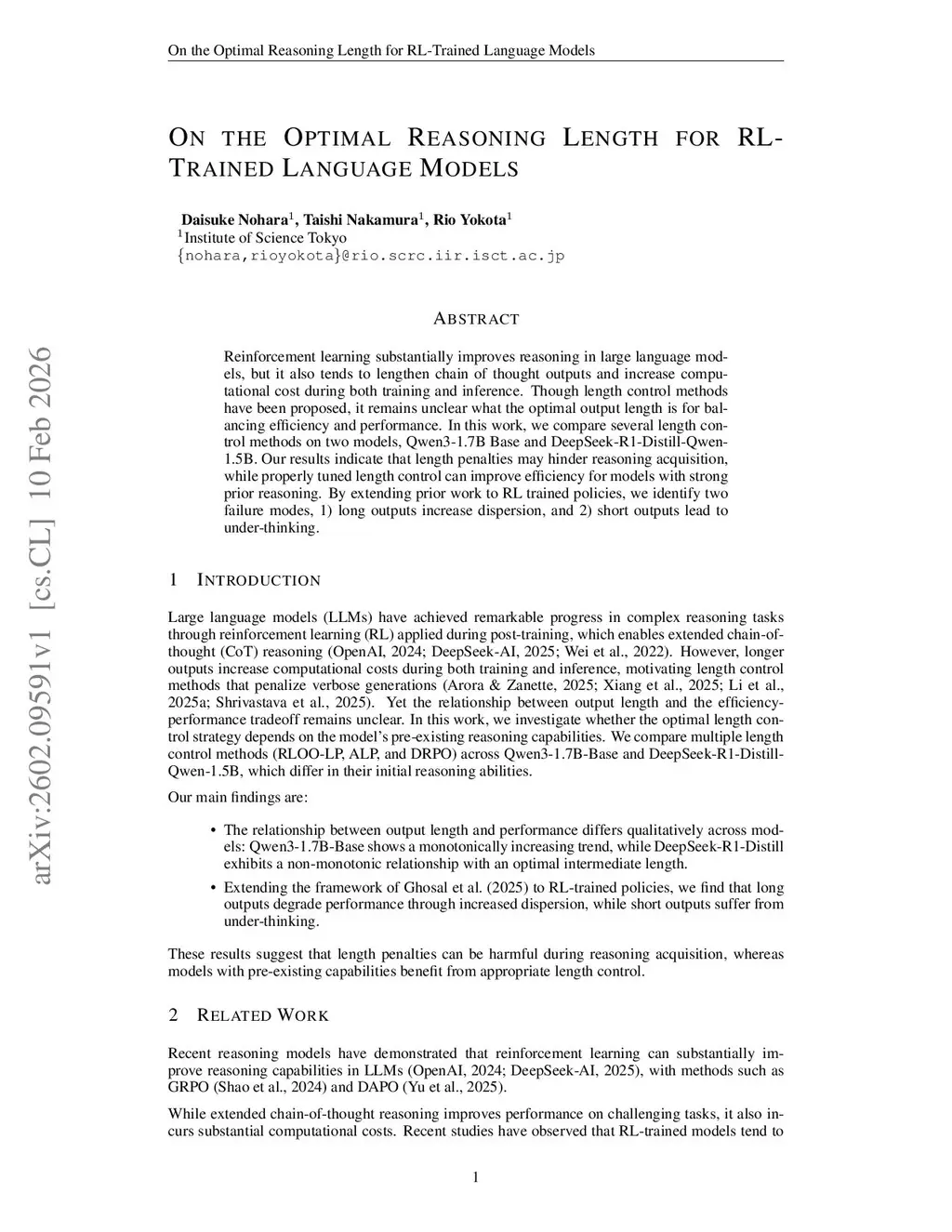 Reinforcement learning substantially improves reasoning in large language models, but it also tends to lengthen chain of thought outputs and increase computational cost during both training and inference. Though length control methods have been proposed, it remains unclear what the optimal output length is for balancing efficiency and performance. In this work, we compare several length control methods on two models, Qwen3-1.7B Base and DeepSeek-R1-Distill-Qwen-1.5B. Our results indicate that length penalties may hinder reasoning acquisition, while properly tuned length control can improve efficiency for models with strong prior reasoning. By extending prior work to RL trained policies, we identify two failure modes, 1) long outputs increase dispersion, and 2) short outputs lead to under-thinking.