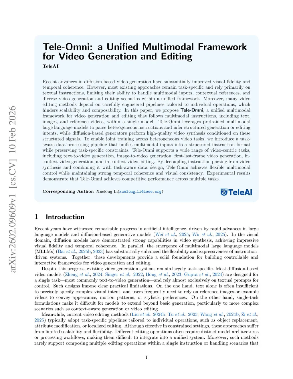 Recent advances in diffusion-based video generation have substantially improved visual fidelity and temporal coherence. However, most existing approaches remain task-specific and rely primarily on textual instructions, limiting their ability to handle multimodal inputs, contextual references, and diverse video generation and editing scenarios within a unified framework. Moreover, many video editing methods depend on carefully engineered pipelines tailored to individual operations, which hinders scalability and composability. In this paper, we propose Tele-Omni, a unified multimodal framework for video generation and editing that follows multimodal instructions, including text, images, and reference videos, within a single model. Tele-Omni leverages pretrained multimodal large language models to parse heterogeneous instructions and infer structured generation or editing intents, while diffusion-based generators perform high-quality video synthesis conditioned on these structured signals. To enable joint training across heterogeneous video tasks, we introduce a task-aware data processing pipeline that unifies multimodal inputs into a structured instruction format while preserving task-specific constraints. Tele-Omni supports a wide range of video-centric tasks, including text-to-video generation, image-to-video generation, first-last-frame video generation, in-context video generation, and in-context video editing. By decoupling instruction parsing from video synthesis and combining it with task-aware data design, Tele-Omni achieves flexible multimodal control while maintaining strong temporal coherence and visual consistency. Experimental results demonstrate that Tele-Omni achieves competitive performance across multiple tasks.